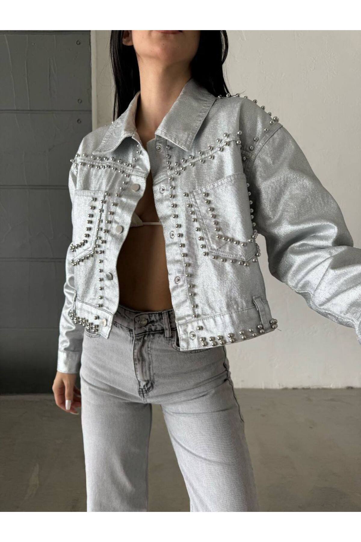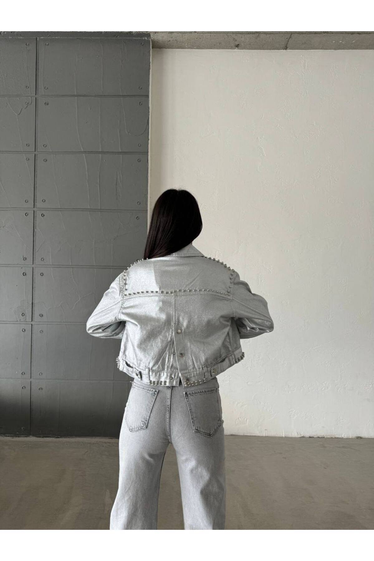 Ceket - FM108 Model Taş detaylı Gümüş Kot Ceket. Ceket - FM108 Model Taş detaylı Gümüş Kot Ceket. 30102409182 L