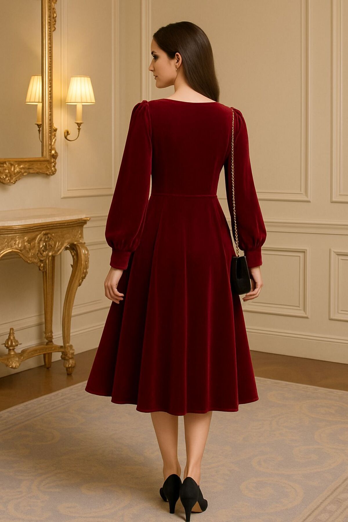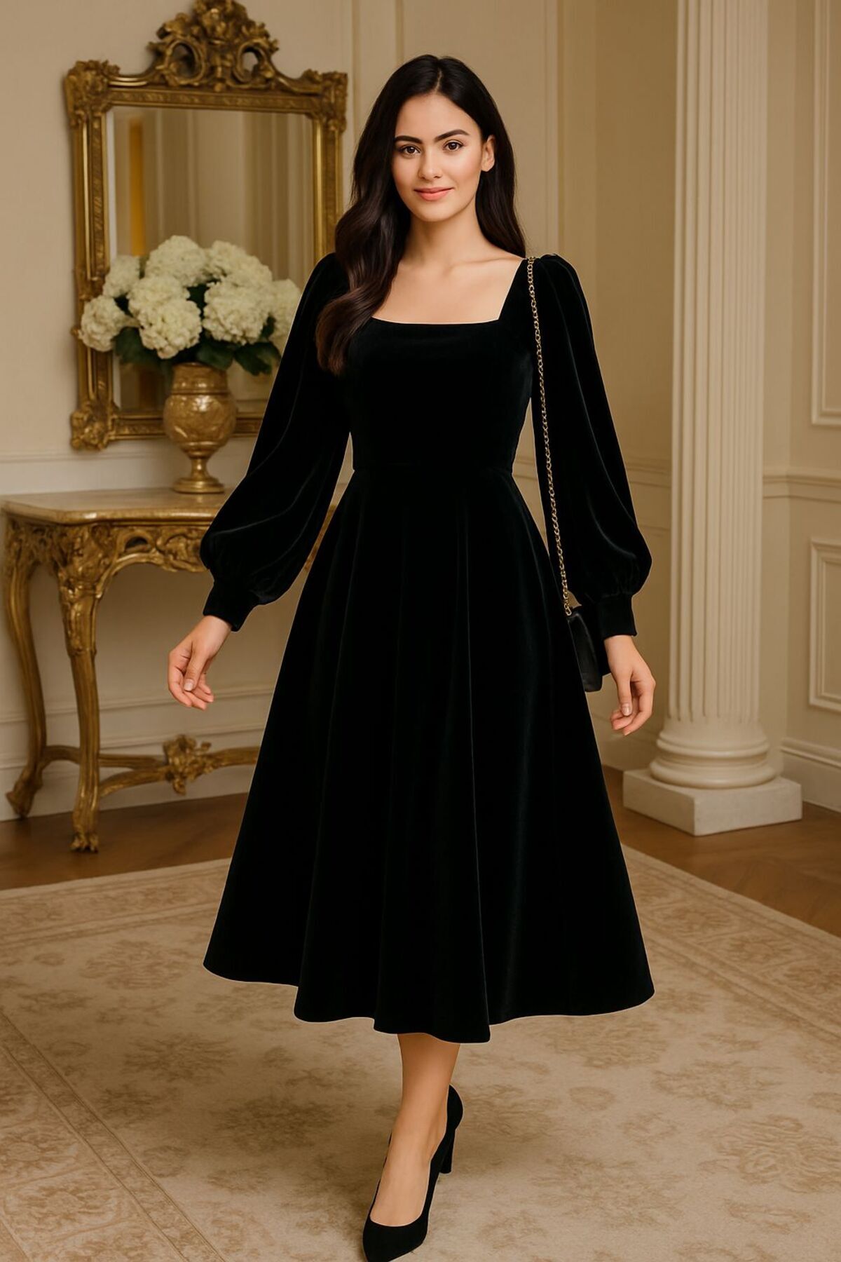 Kare Yaka Uzun Kollu Midi Boy Elbise Kare Yaka Uzun Kollu Midi Boy Elbise drs09099 3XL