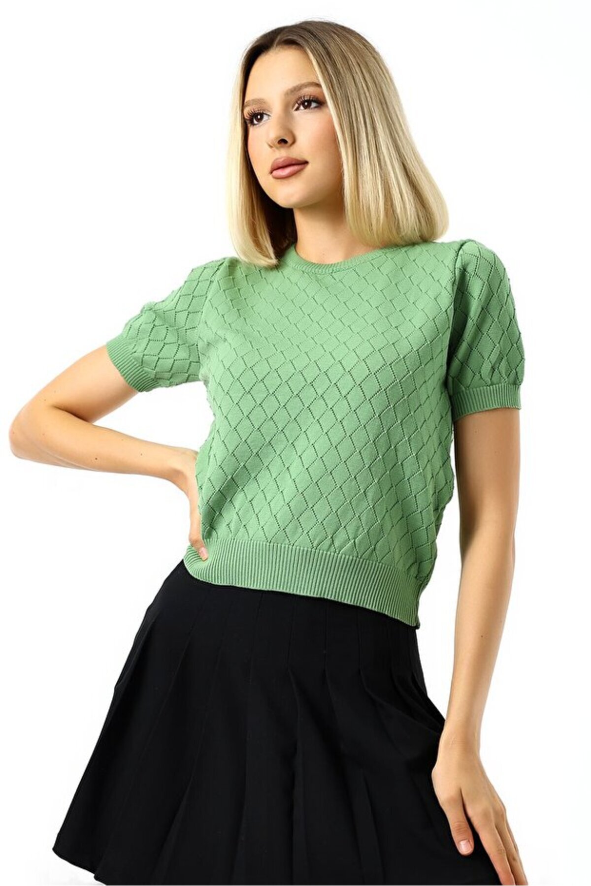 Kadın Çağla Baklava Desenli Kısa Kol Ajurlu Triko Bluz Kadın Çağla Baklava Desenli Kısa Kol Ajurlu Triko Bluz BAKLAVA-KISA-KOL Standart