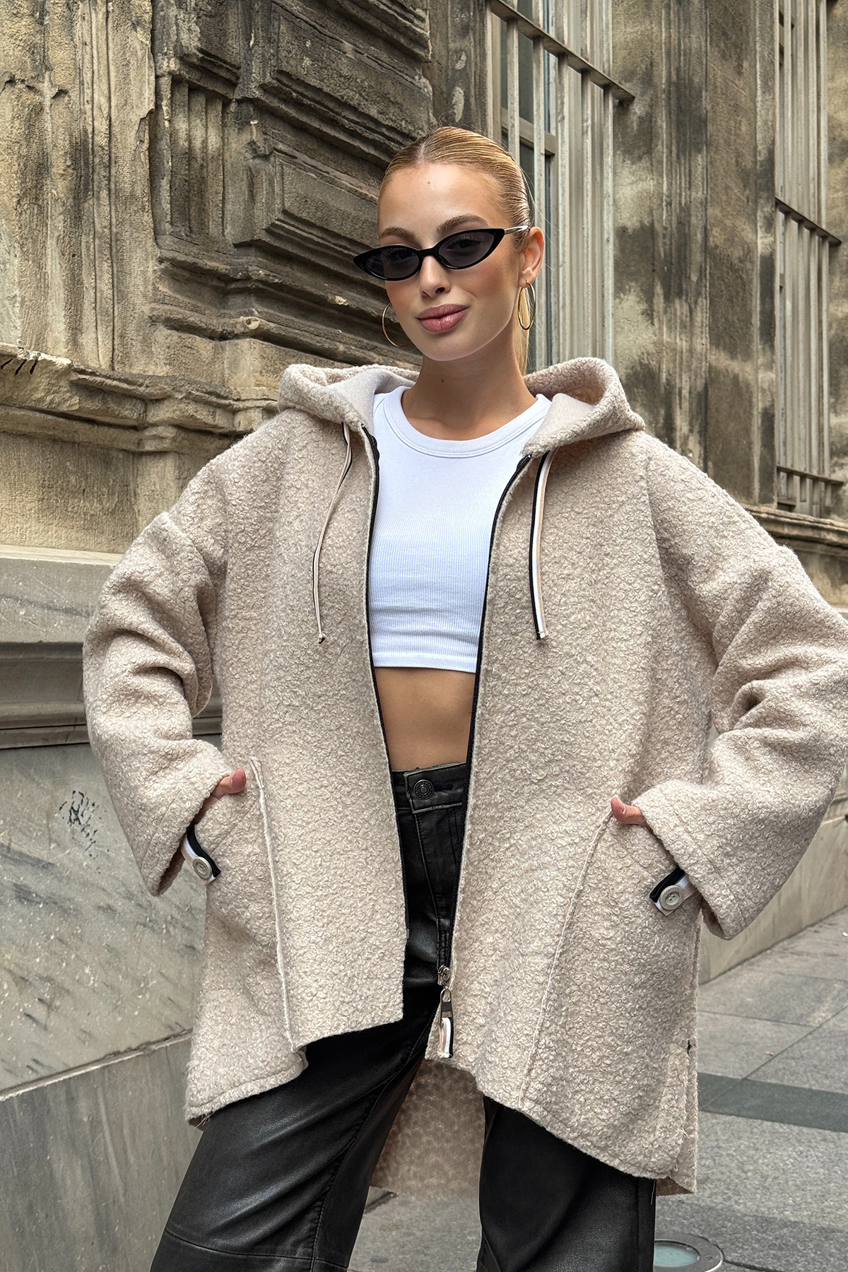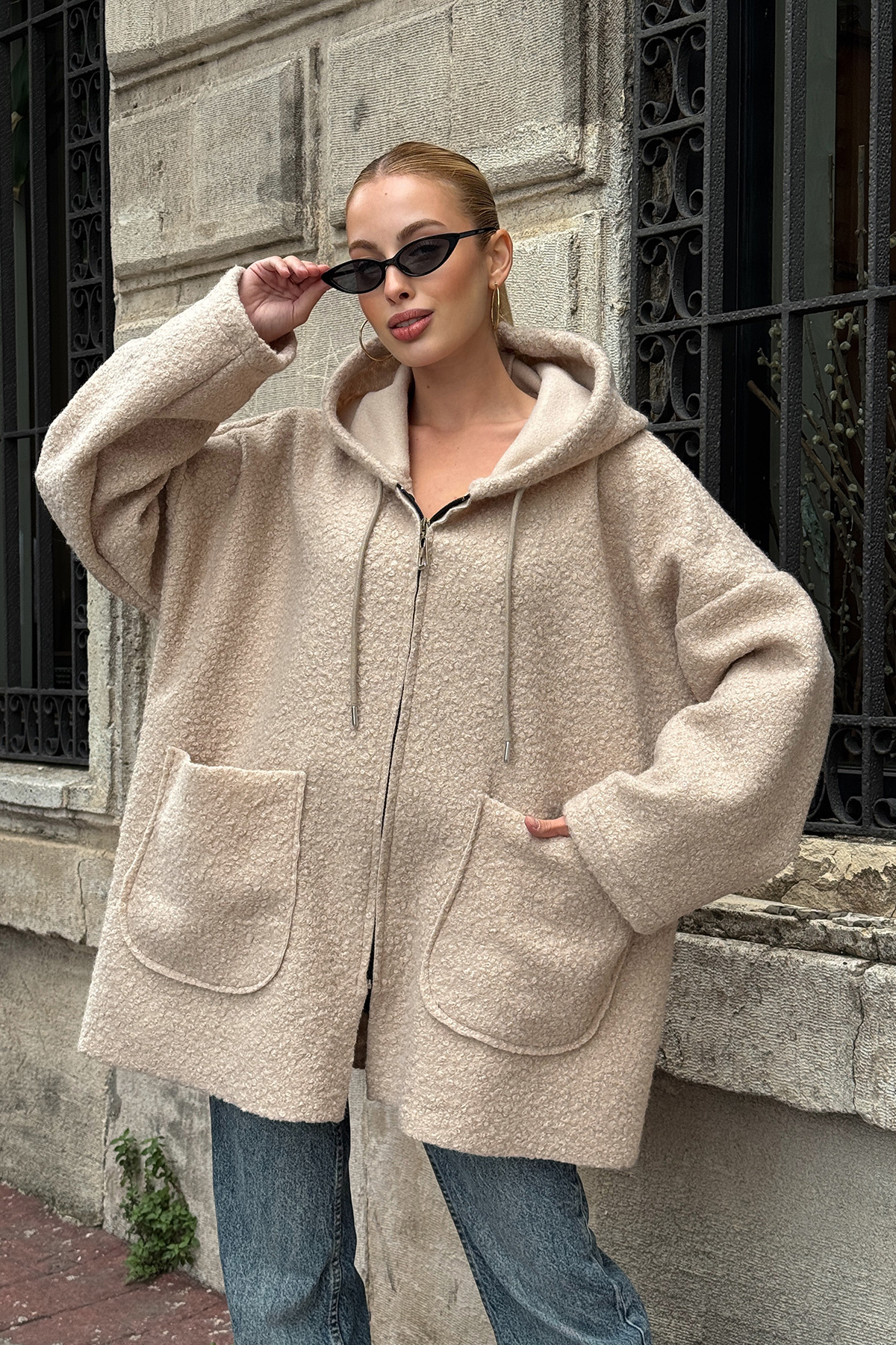 Kadın Taş Kapüşonlu Çift Cepli Oversize Buklet Ceket Kaban BCVL-25V608 Kadın Taş Kapüşonlu Çift Cepli Oversize Buklet Ceket Kaban BCVL-25V608 40-42