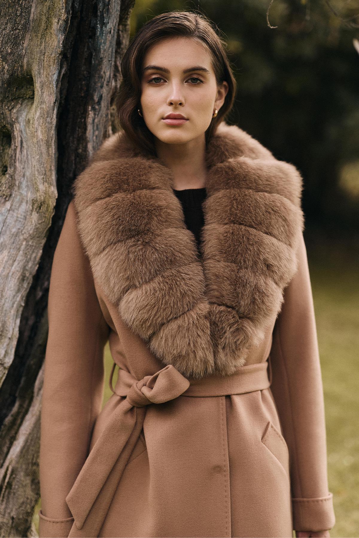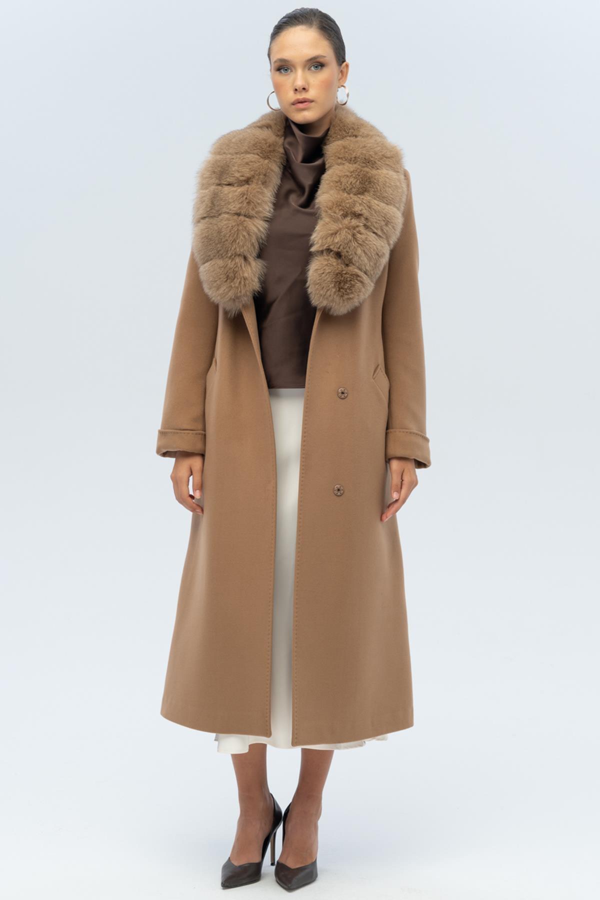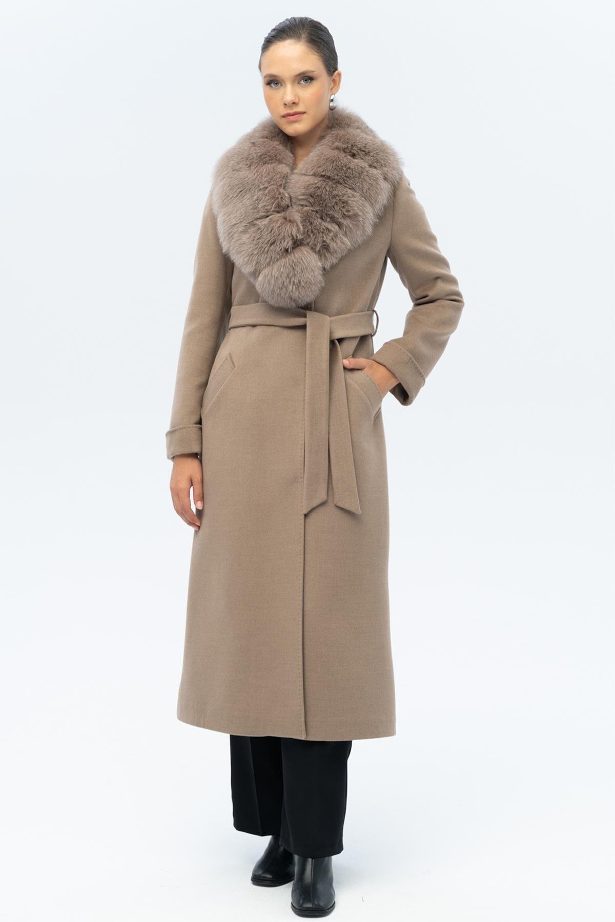 Çıkabilir Kürklü Belden Bağlamalı Uzun Kaşmir Kaban KAMEL 3133-TK Çıkabilir Kürklü Belden Bağlamalı Uzun Kaşmir Kaban KAMEL 3133-TK 44