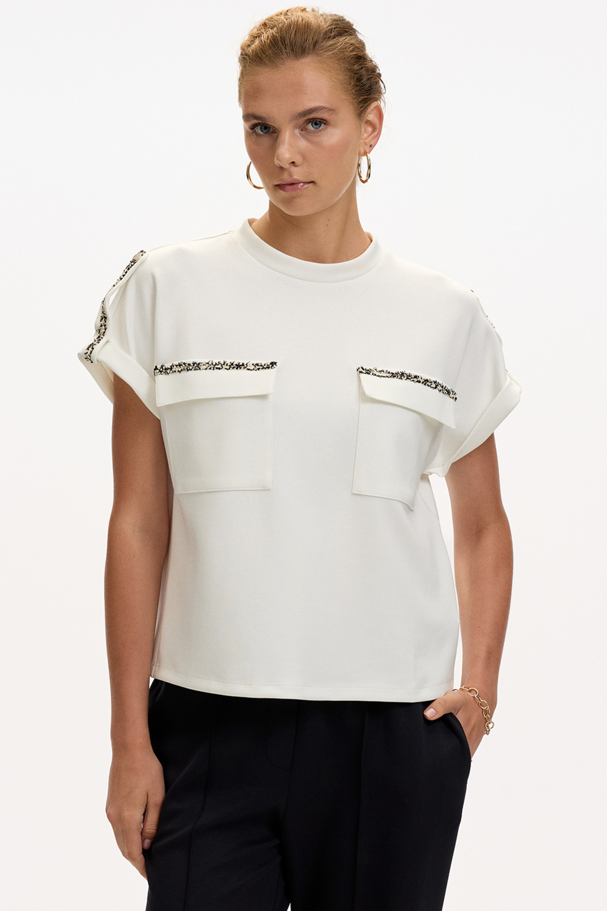 Şerit Detaylı Cepli Ekru Örme Ekru Tişört Şerit Detaylı Cepli Ekru Örme Ekru Tişört A25Y05276002 L