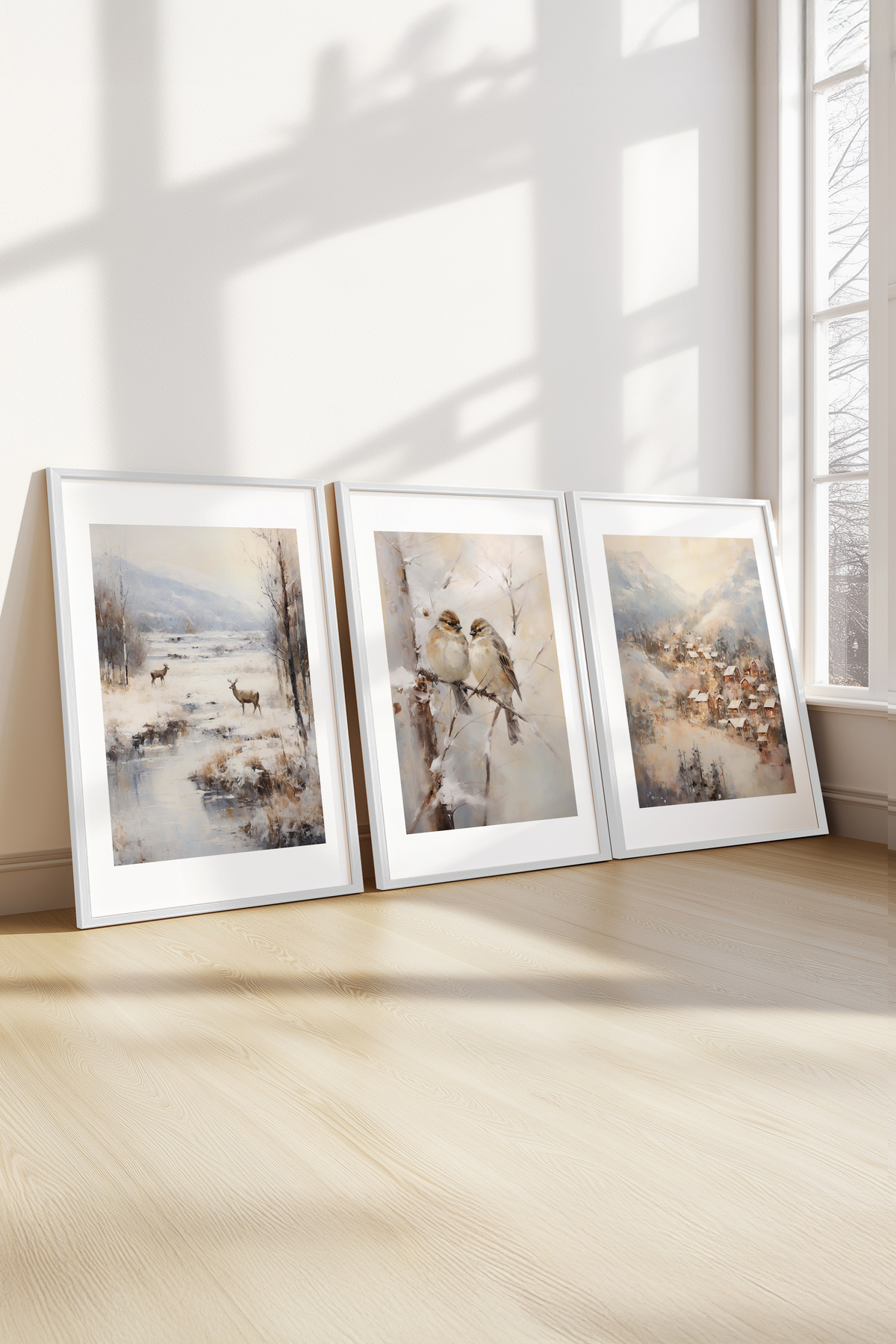 Beyaz Çerçeveli Yağlıboya Efektli Kuşlu Geyikli Kış Manzaralı 3'lü Tablo Seti Yuna126 Beyaz Çerçeveli Yağlıboya Efektli Kuşlu Geyikli Kış Manzaralı 3'lü Tablo Seti Yuna126 yuna126 50 x 70