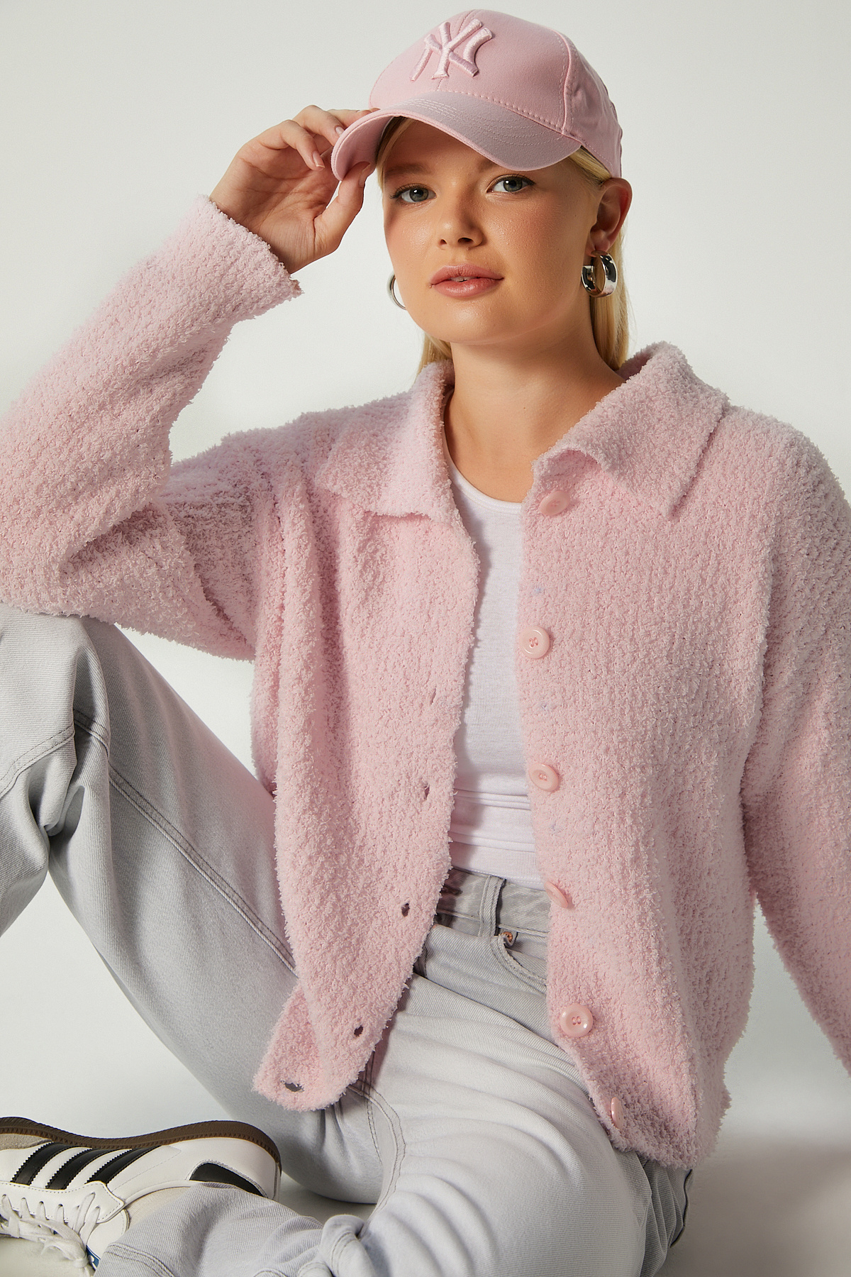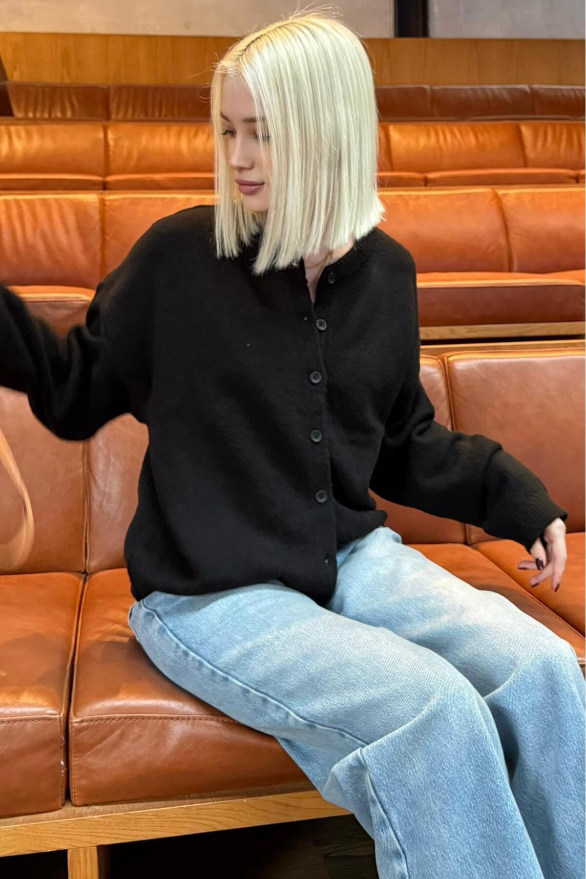 Pembe Rahat Kalıp Düğmeli Triko Kadın Hırka MG2552 Pembe Rahat Kalıp Düğmeli Triko Kadın Hırka MG2552 L