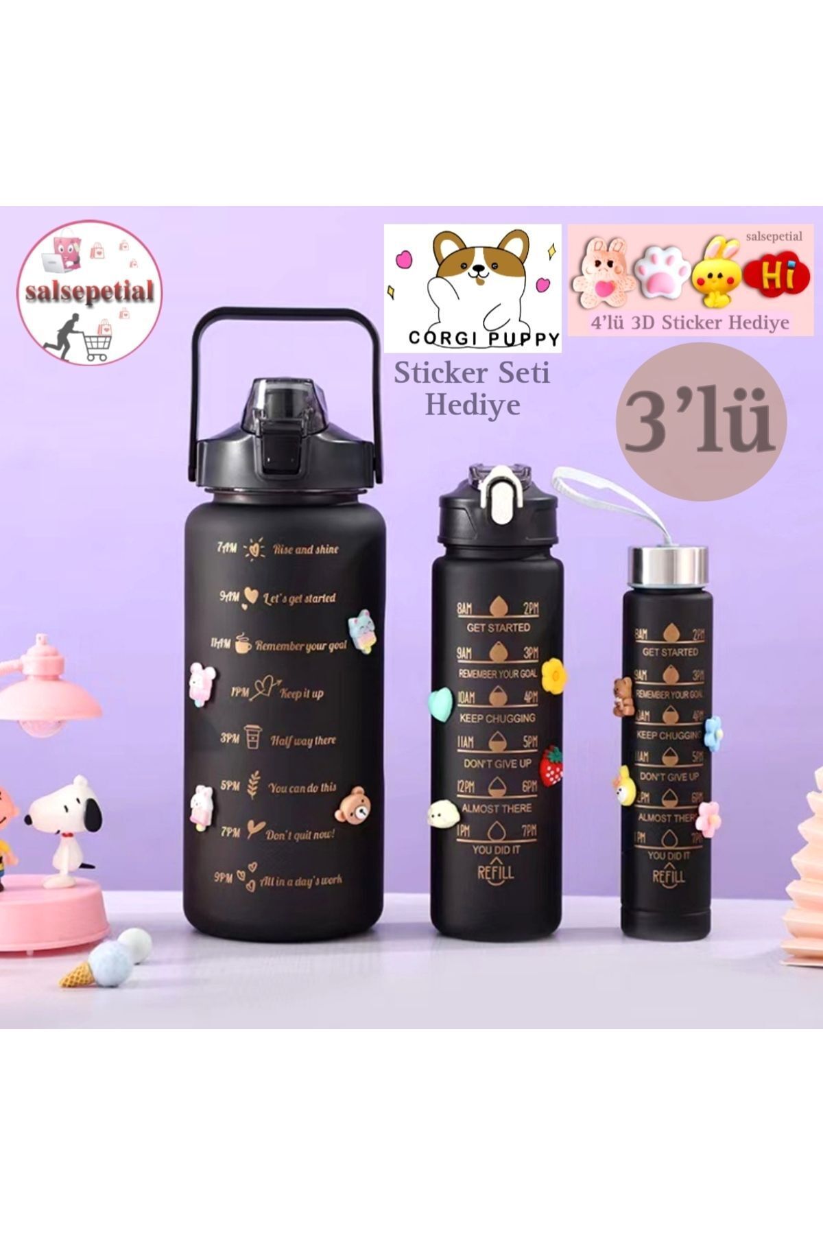 Siyah, 3’lü Set - Sticker’lı Pipetli Matara Seti - 2000ml,900ml,300ml Siyah, 3’lü Set - Sticker’lı Pipetli Matara Seti - 2000ml,900ml,300ml SKUSB0281 تک سایز