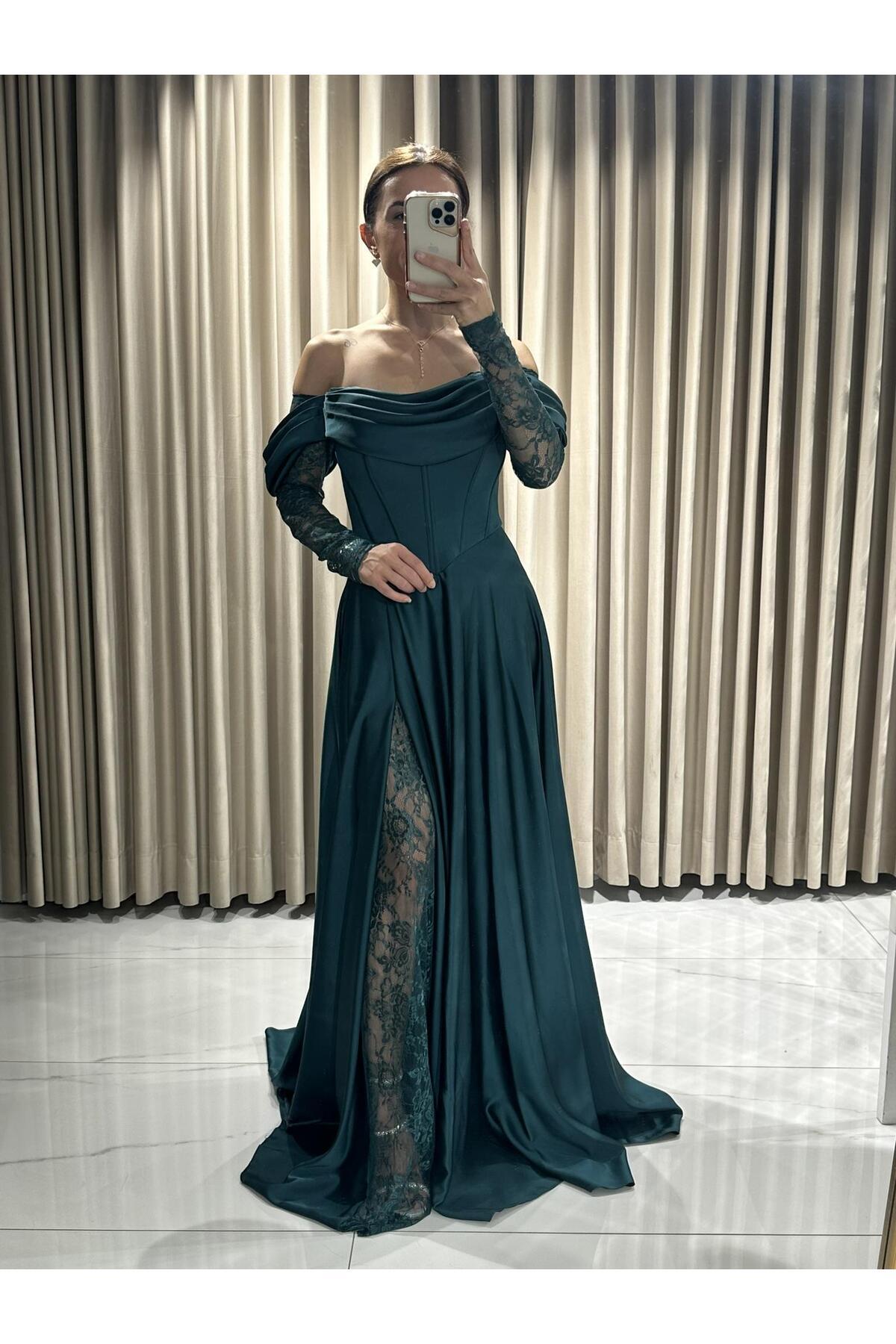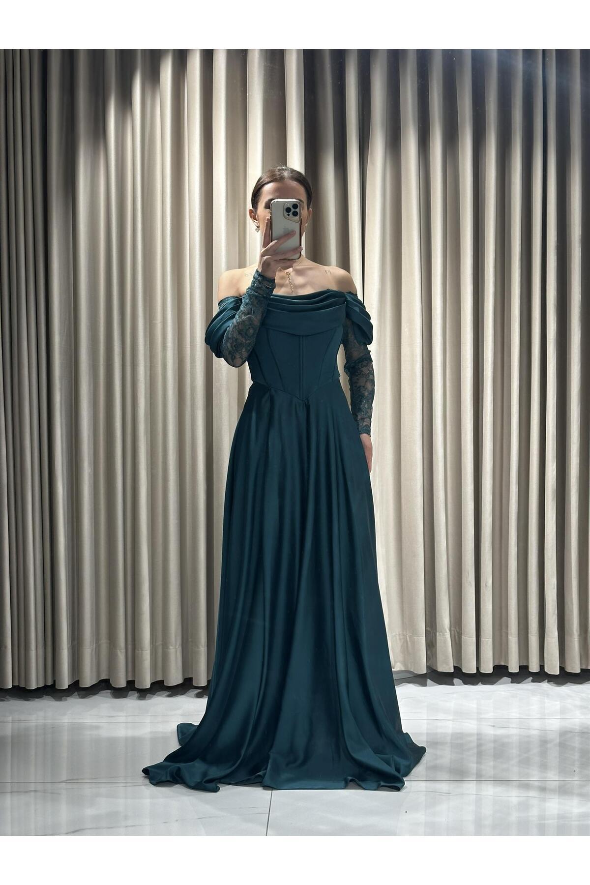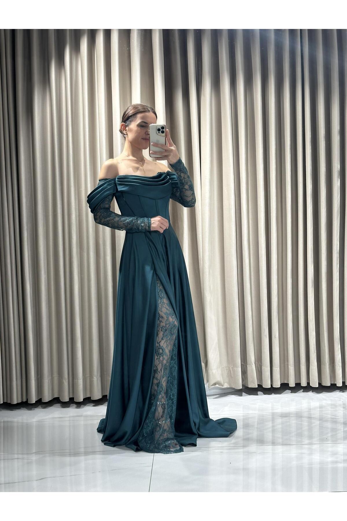 Zümrüt Yeşili Kayık Yaka Dantel Kollu Abiye Elbise 5561 Zümrüt Yeşili Kayık Yaka Dantel Kollu Abiye Elbise 5561 En5561 48