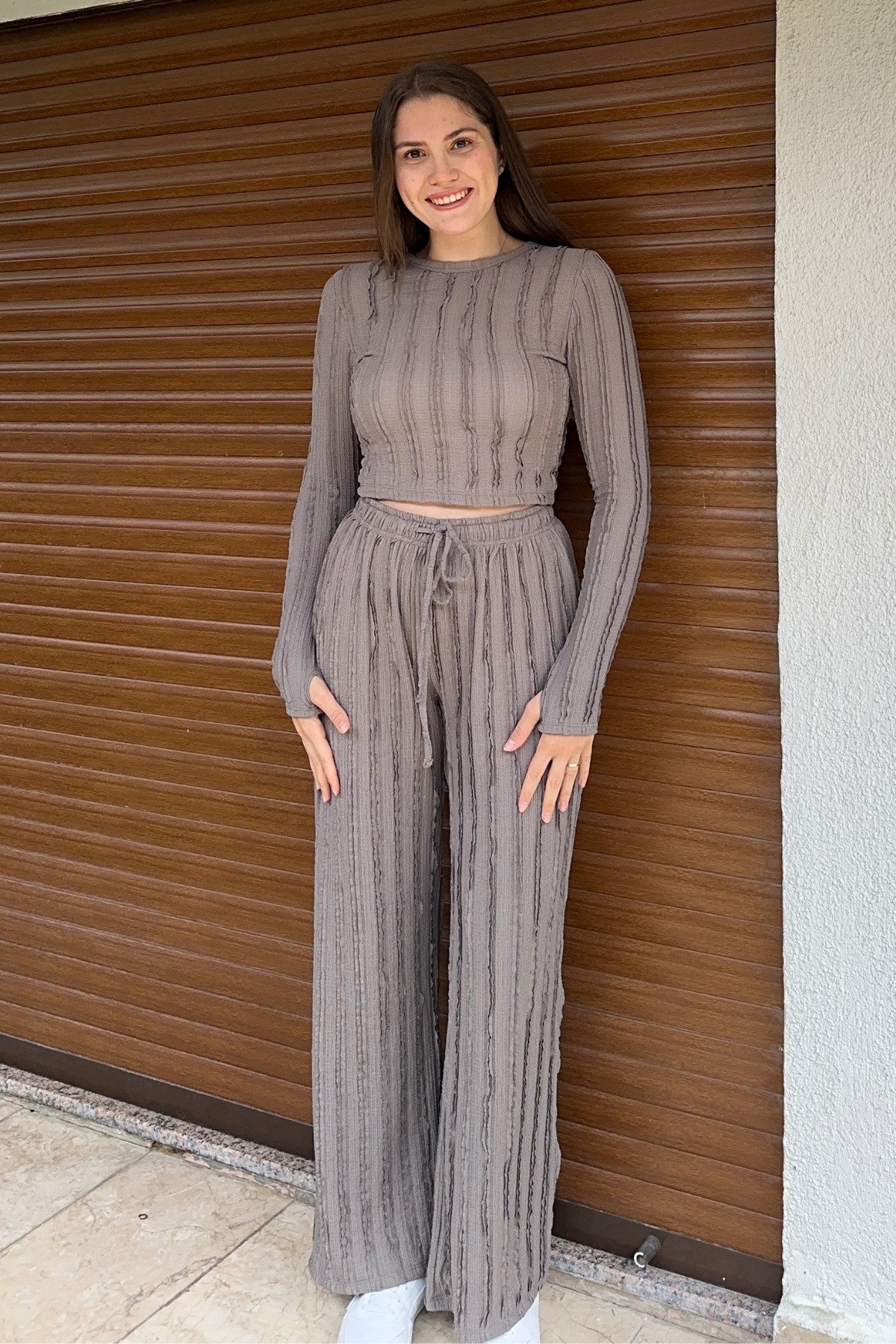 Bisiklet Yaka Ters Dikiş Parmak Geçmeli Crop ve Pantolon 2'li Takım Bisiklet Yaka Ters Dikiş Parmak Geçmeli Crop ve Pantolon 2'li Takım G1721 L