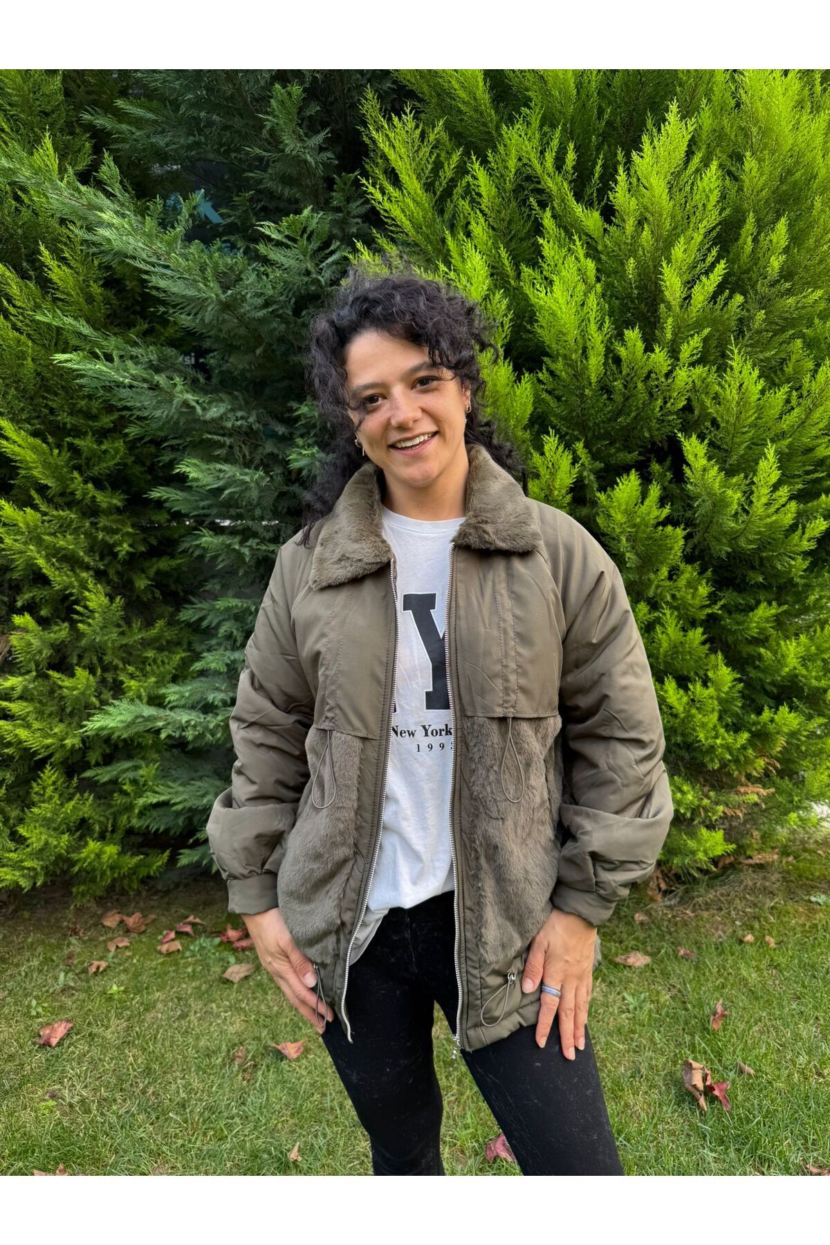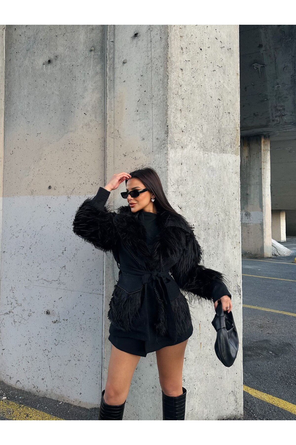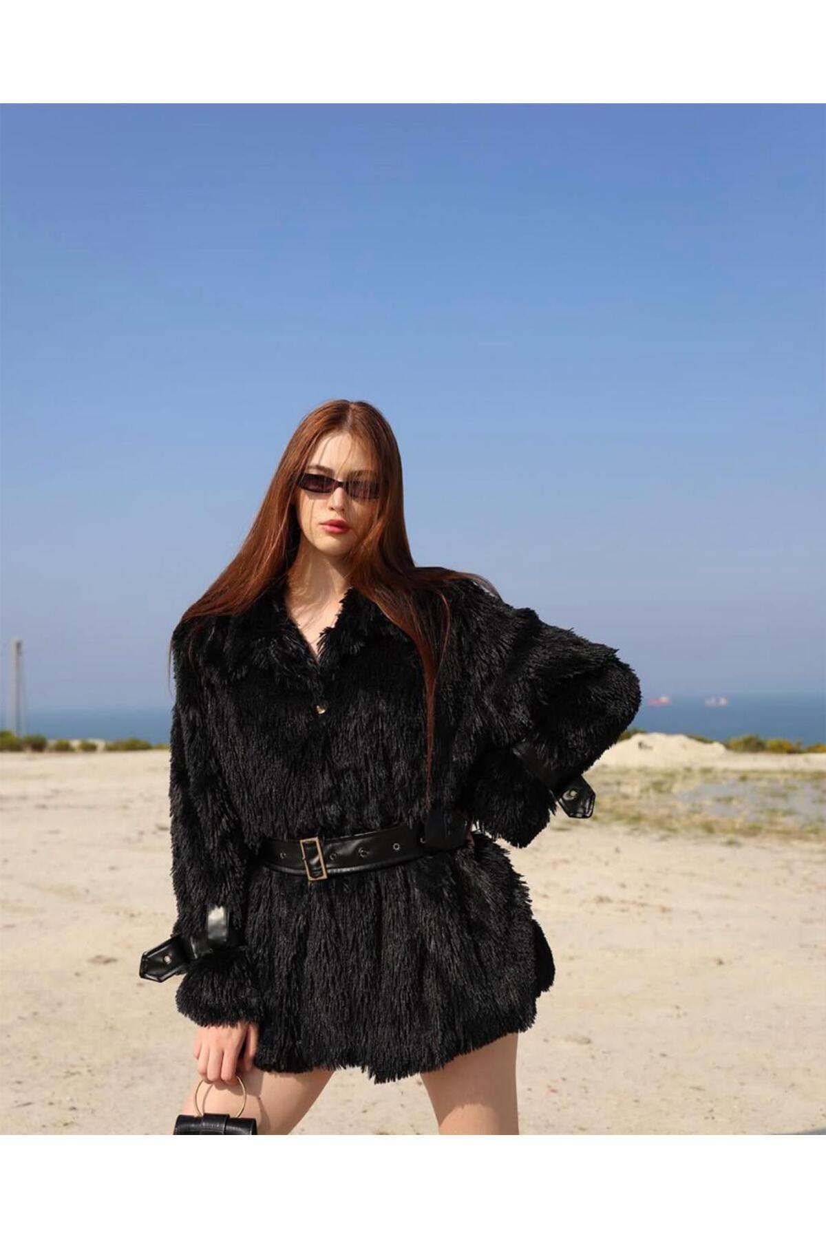 HOPEFULDESİGN Peluş Kürk Düğmeli Deri Kemerli Kol Deri Detaylı Cepli Mont Kaban HOPEFULDESİGN Peluş Kürk Düğmeli Deri Kemerli Kol Deri Detaylı Cepli Mont Kaban HDS-1000-200 L