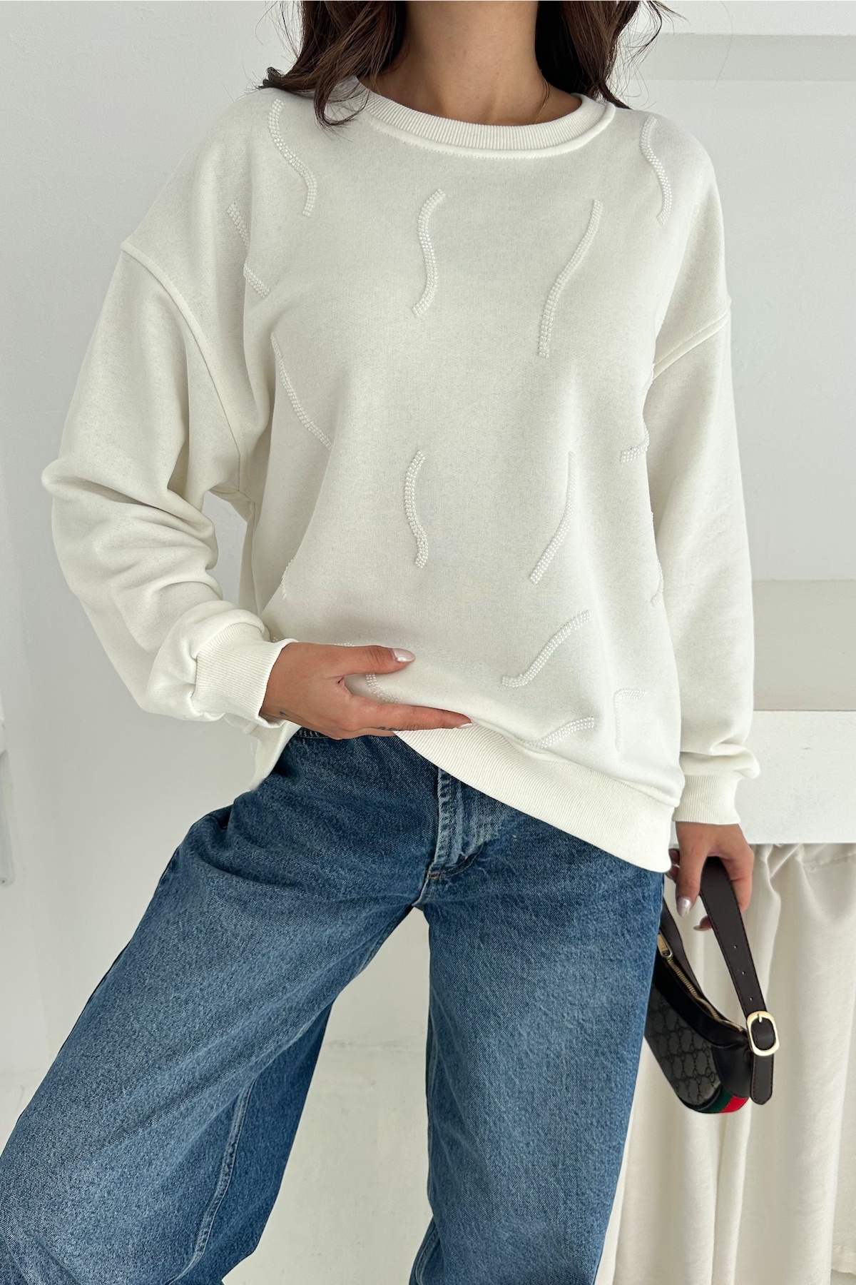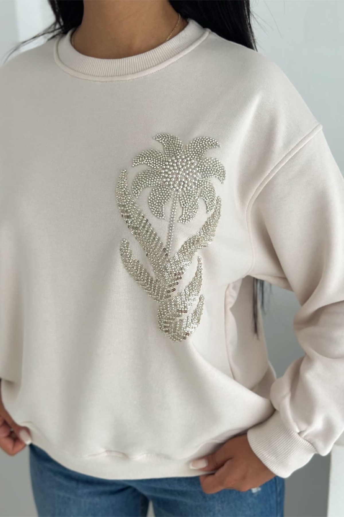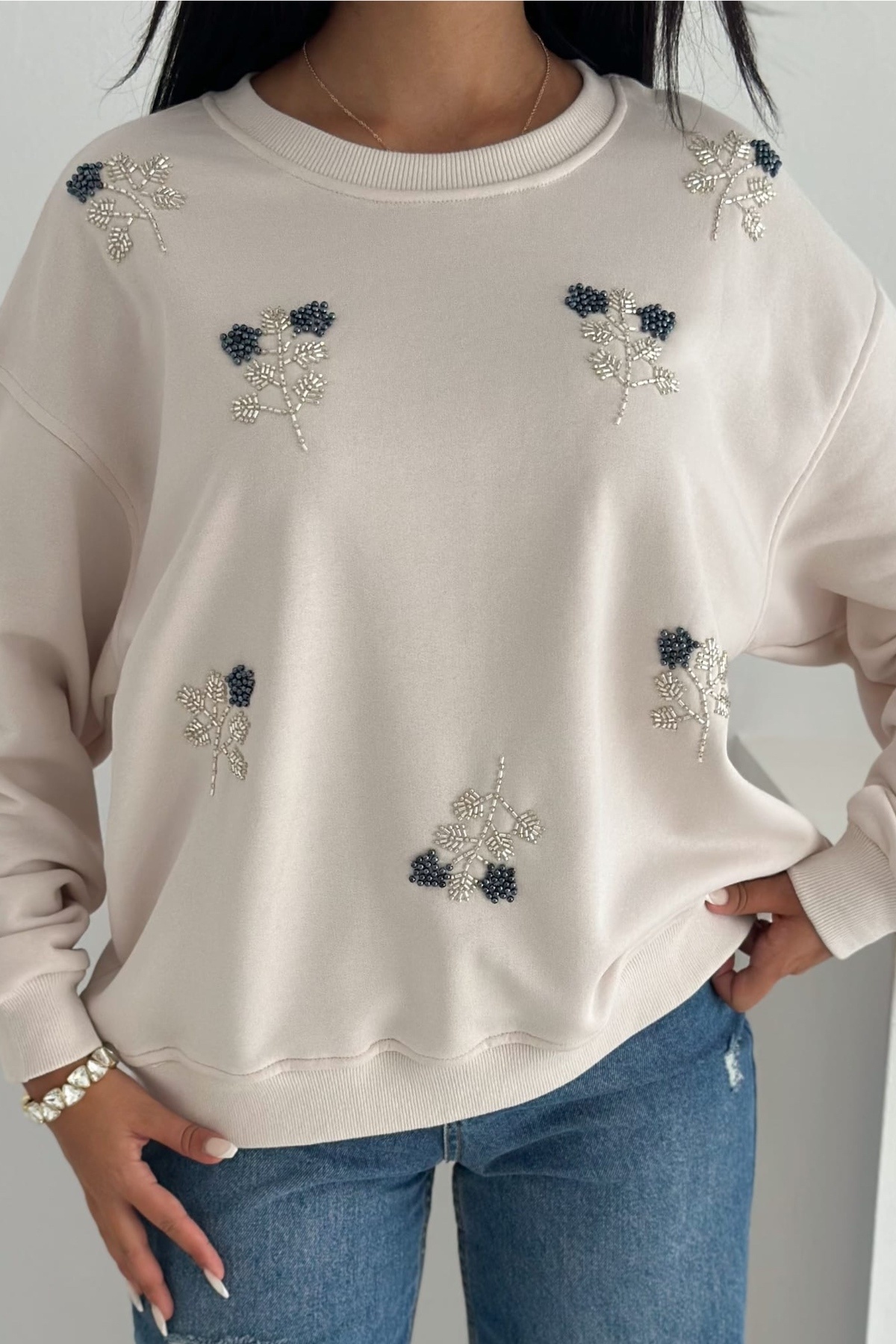 Kadın Beyaz Boncuk İşlemeli %100 Pamuk Sweatshirt Kadın Beyaz Boncuk İşlemeli %100 Pamuk Sweatshirt svt13 XL