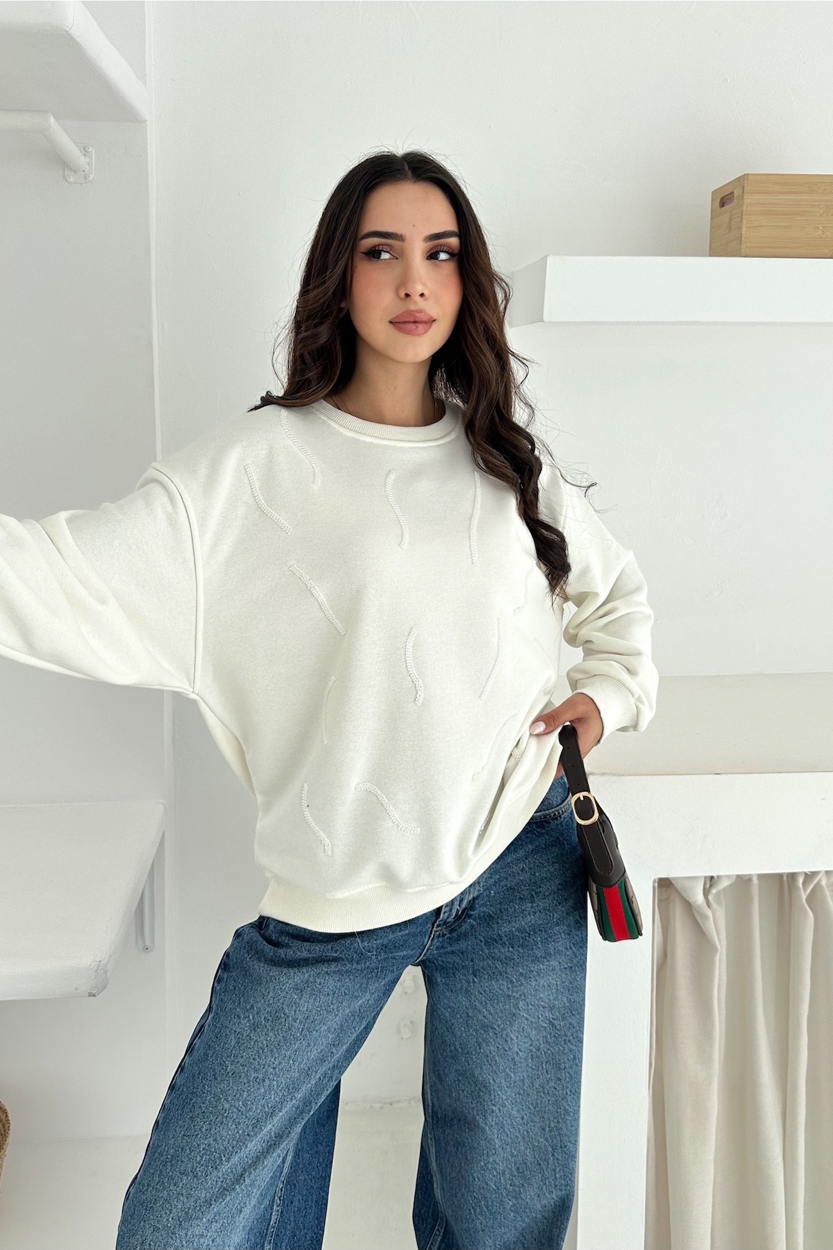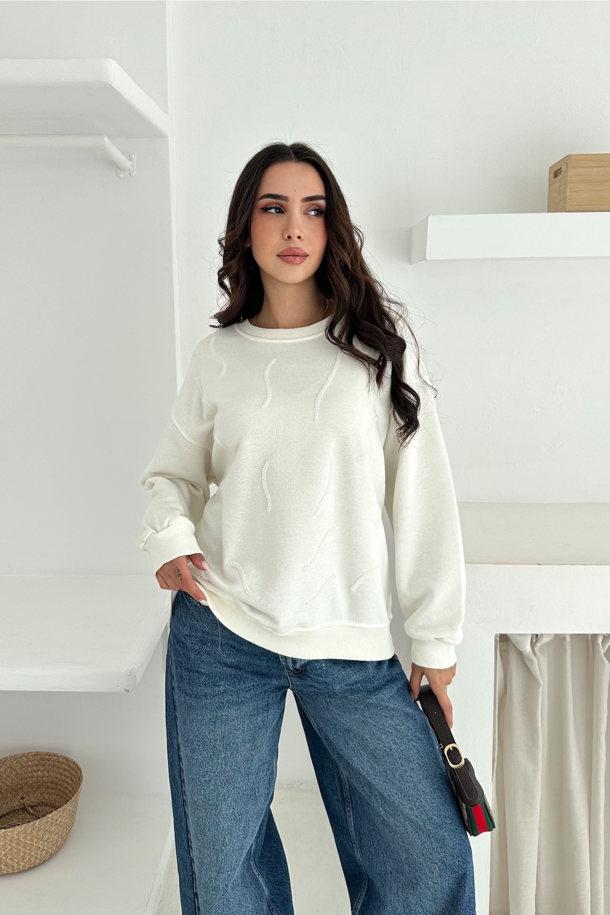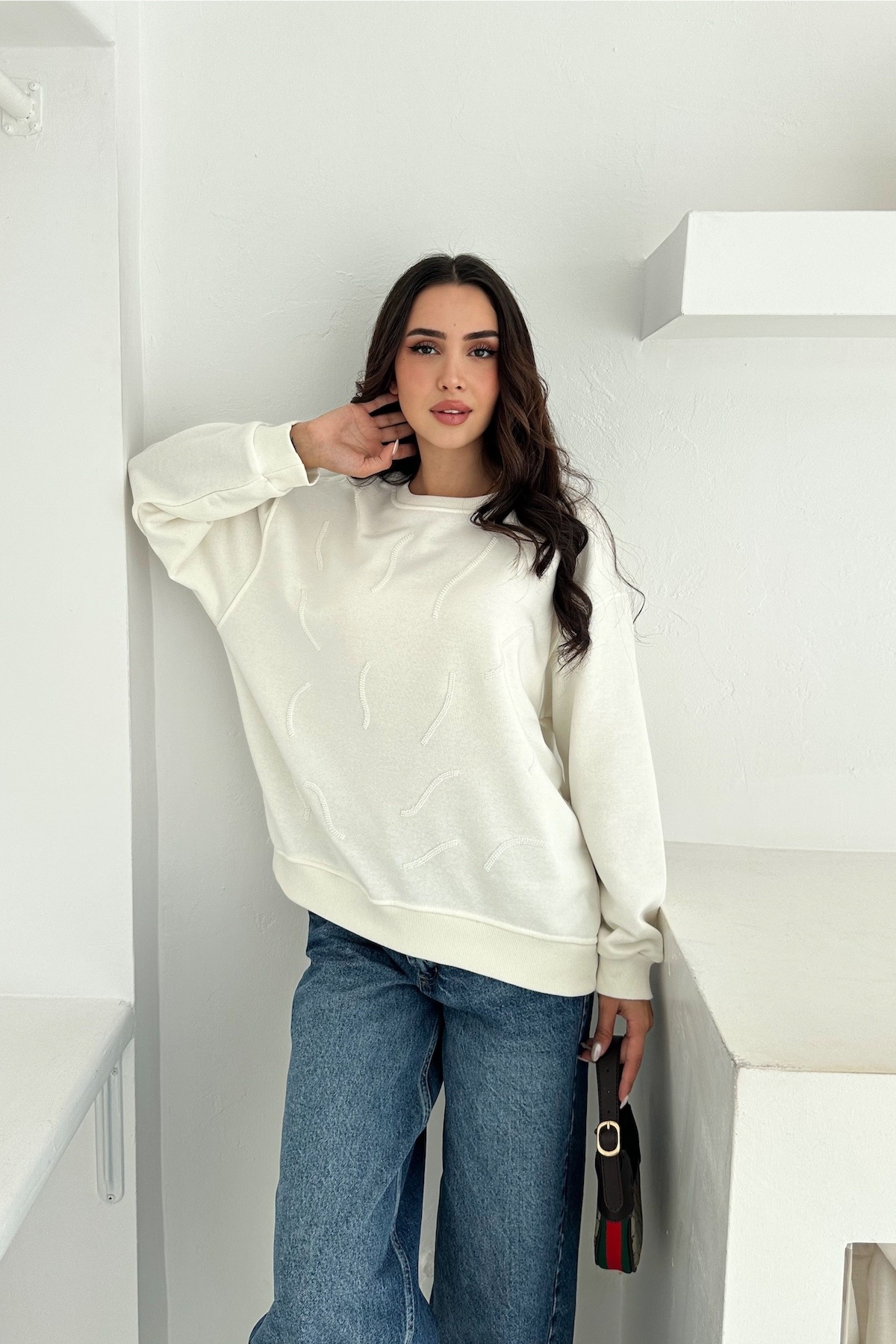 Kadın Beyaz Boncuk İşlemeli %100 Pamuk Sweatshirt Kadın Beyaz Boncuk İşlemeli %100 Pamuk Sweatshirt svt13 XL
