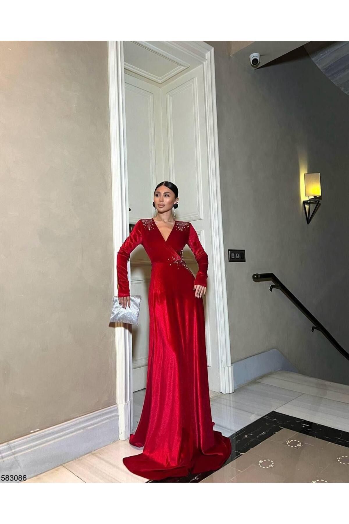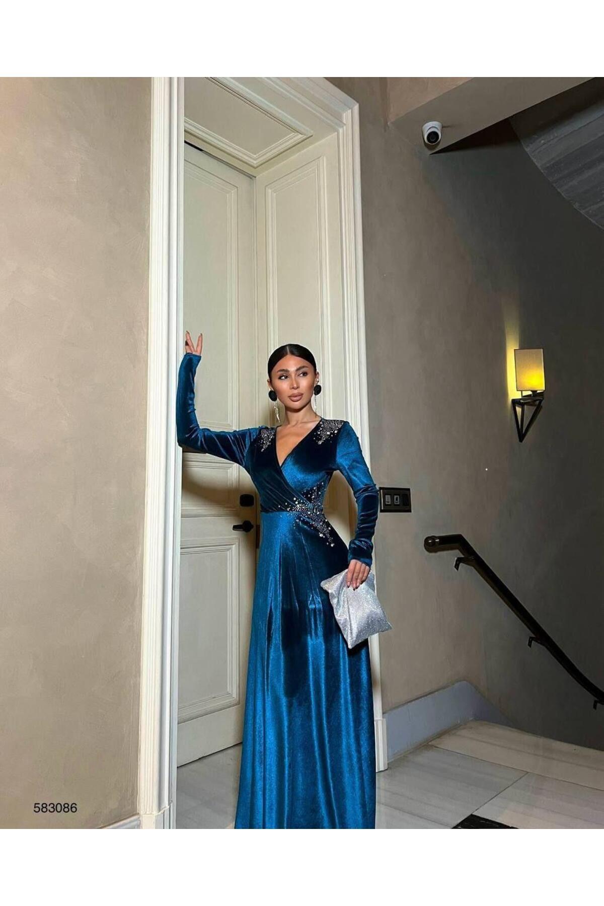 Esnek Kadife Kumaş Taş İşlemeli Abiye Elbise - V Yaka ve Yüksek Yırtmaç 583086 PETROL Esnek Kadife Kumaş Taş İşlemeli Abiye Elbise - V Yaka ve Yüksek Yırtmaç 583086 PETROL L