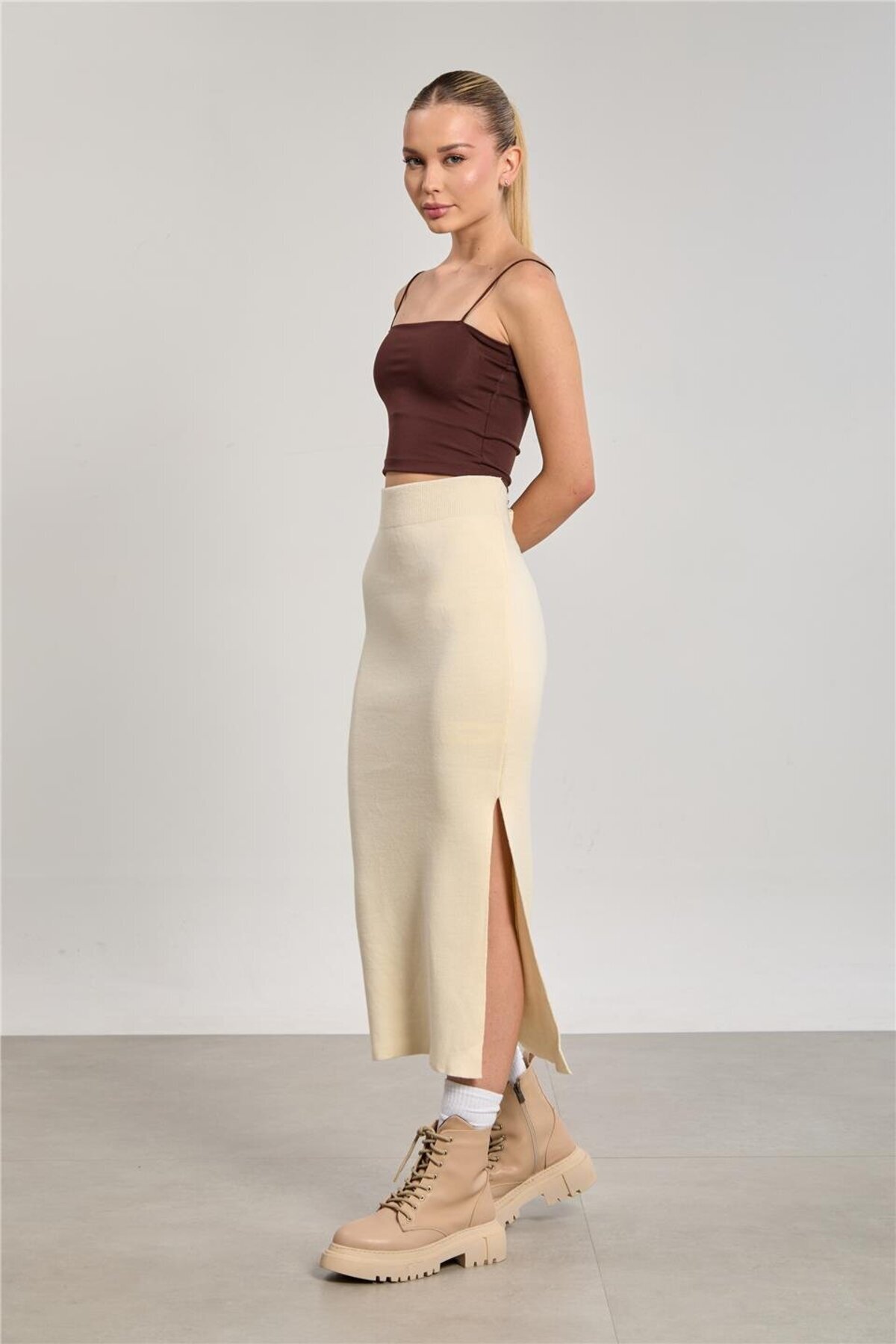 Kadın Volanlı Kısa Süet Etek - Vizon Kadın Volanlı Kısa Süet Etek - Vizon 381-25FL06001 L