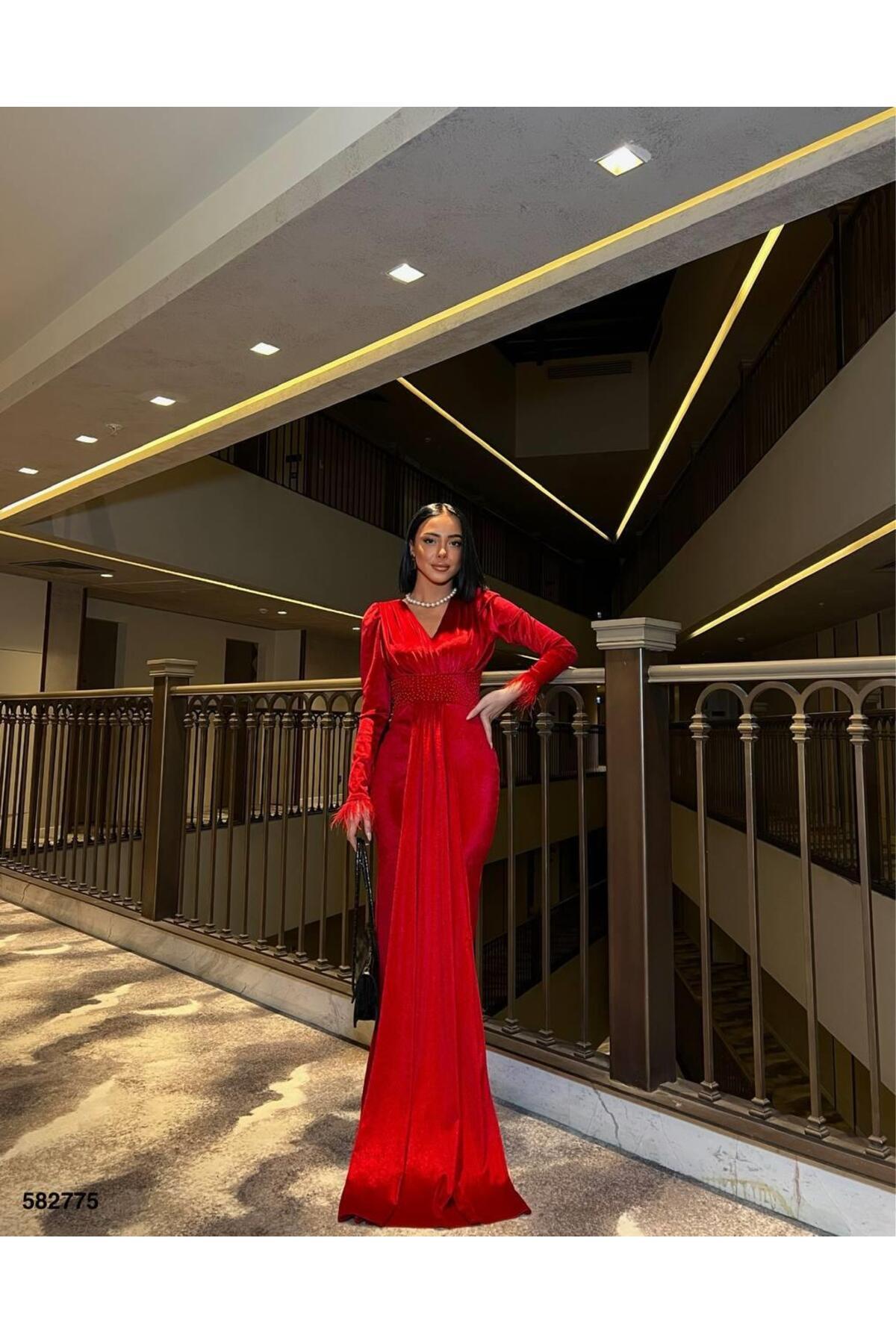 Kadife Esnek Kumaş İnci Tüy Detaylı Abiye Elbise 582775 KIRMIZI Kadife Esnek Kumaş İnci Tüy Detaylı Abiye Elbise 582775 KIRMIZI L