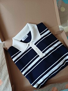 Kadın Polo Yaka Çizgili Düğmeli Triko Kazak Rugby Shirt Lacivert-Beyaz 26W3036 Kadın Polo Yaka Çizgili Düğmeli Triko Kazak Rugby Shirt Lacivert-Beyaz 26W3036 L/XL
