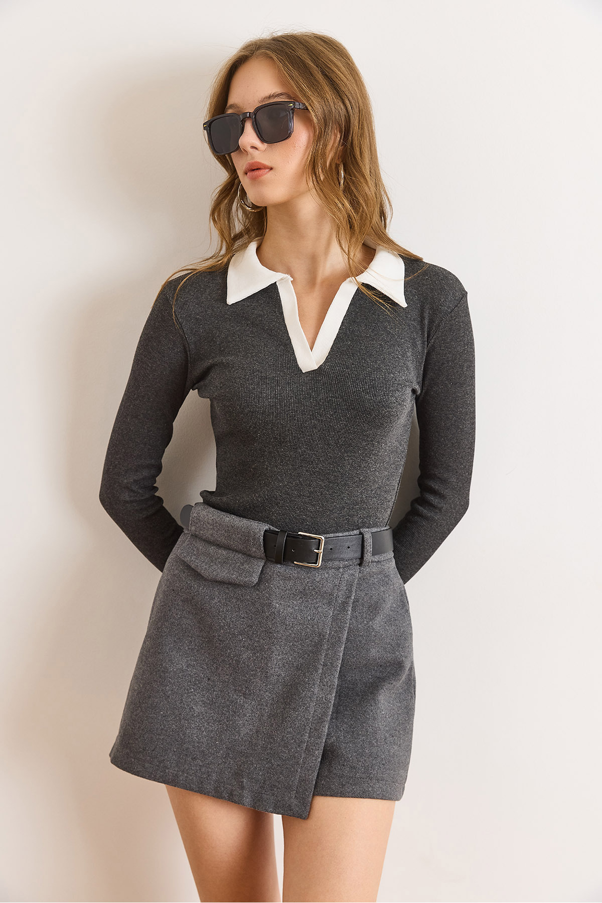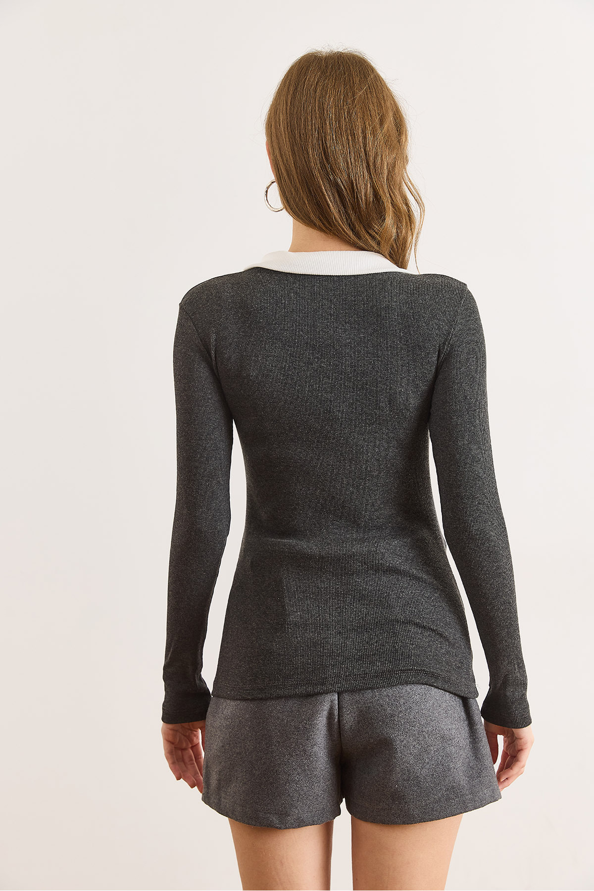 Kadın Füme Beyaz Renk Bloklu Polo Yaka Pamuk Esnek Bluz BLZ-19003104 Kadın Füme Beyaz Renk Bloklu Polo Yaka Pamuk Esnek Bluz BLZ-19003104 XL