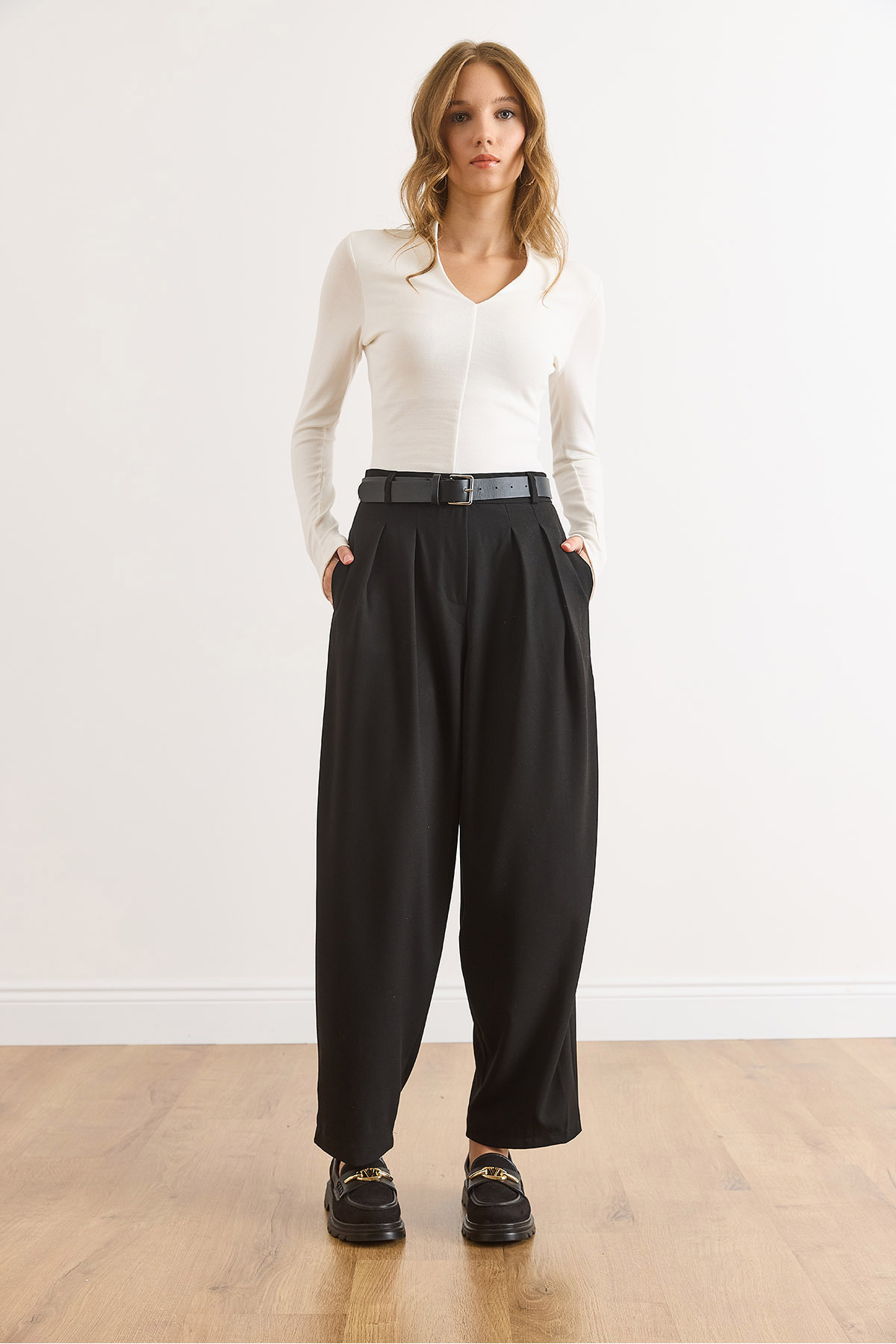Kadın Siyah Cepli Pileli Balon Poliviskon Dökümlü Pantolon PNT-19000370 Kadın Siyah Cepli Pileli Balon Poliviskon Dökümlü Pantolon PNT-19000370 XL