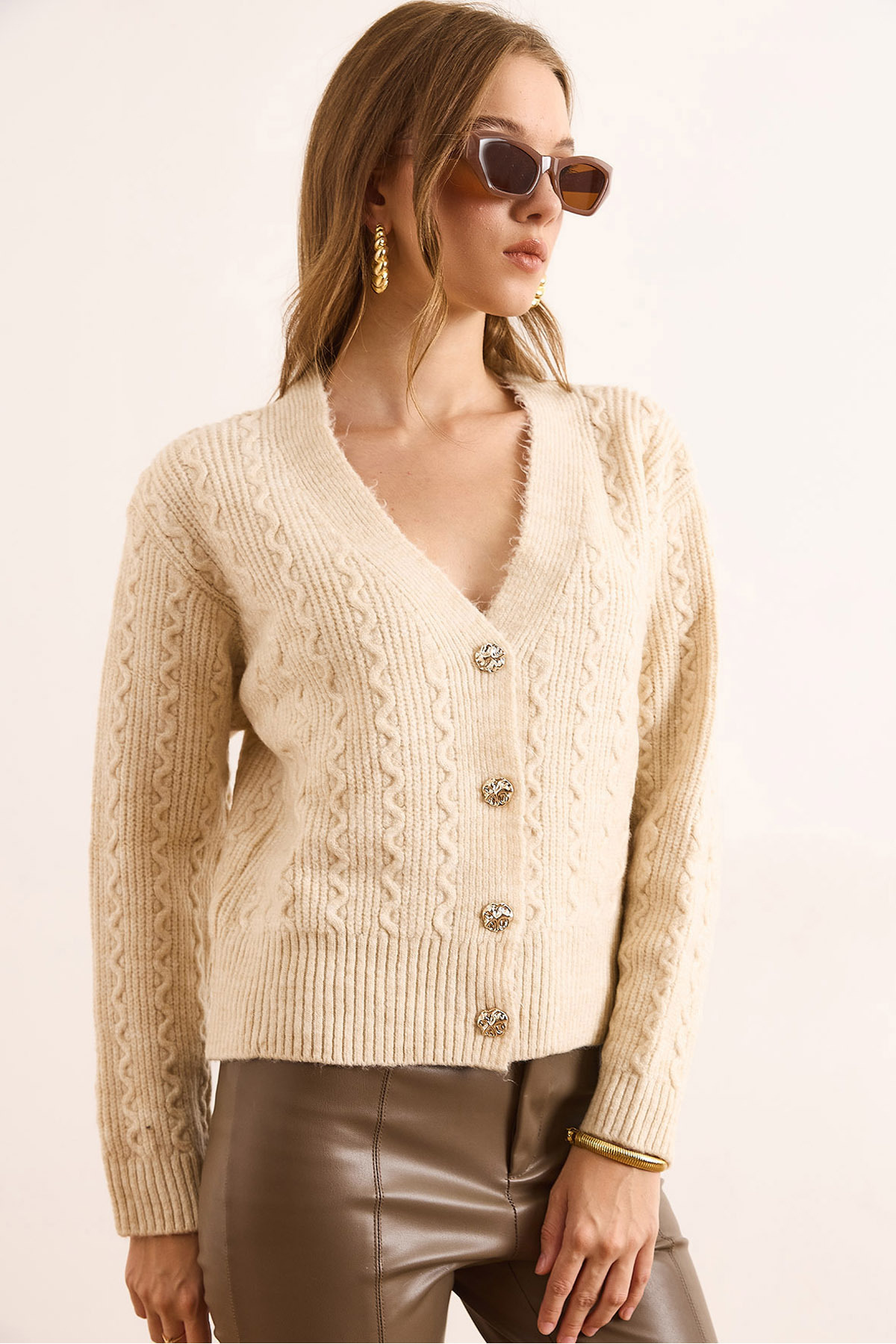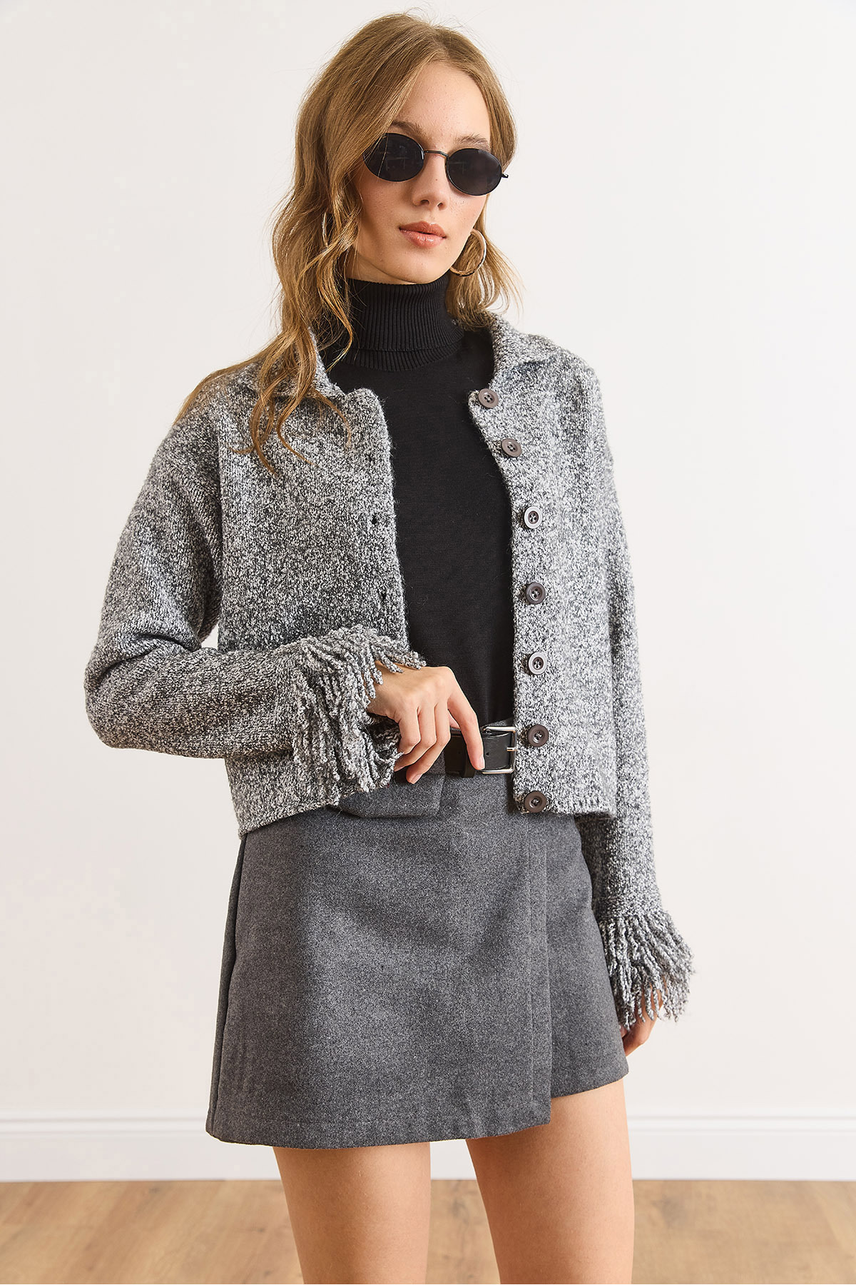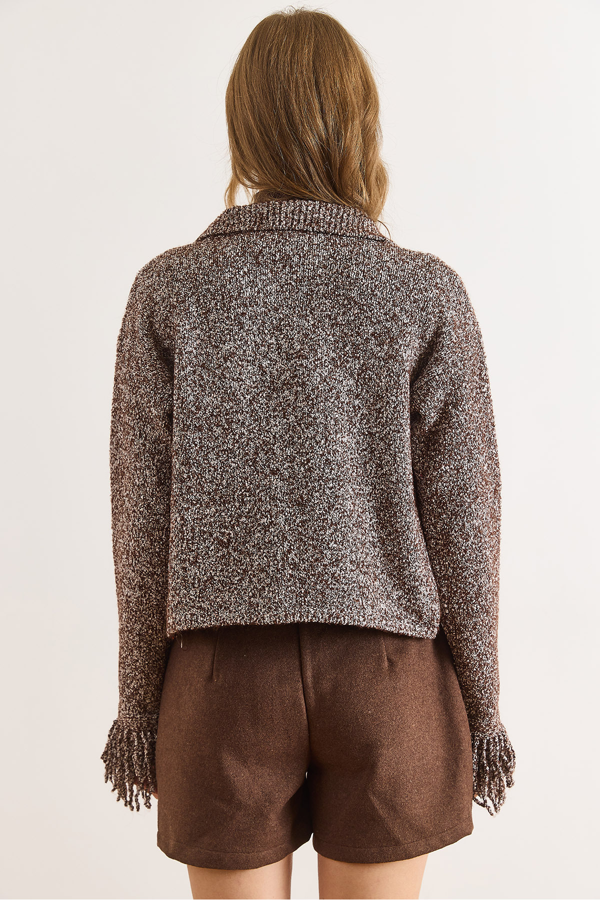 Kadın Kahverengi Manşeti Saçaklı Kırçıllı Triko Hırka HRK-19000419 Kadın Kahverengi Manşeti Saçaklı Kırçıllı Triko Hırka HRK-19000419 تک سایز