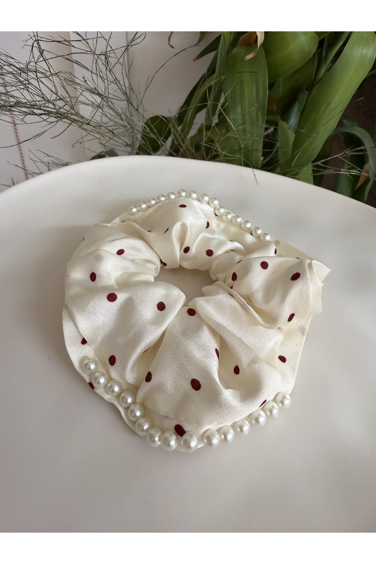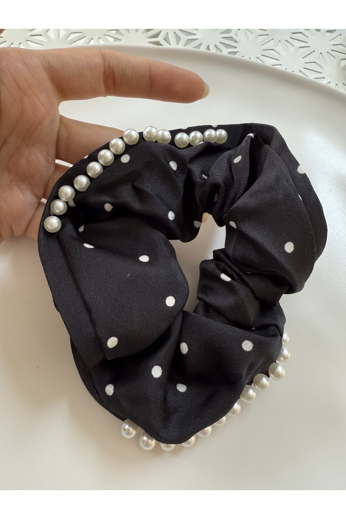 Puantiyeli Parlak Kumaş İnci Detaylı Lastik Saç Tokası Puantiyeli Parlak Kumaş İnci Detaylı Lastik Saç Tokası 100098 تک سایز