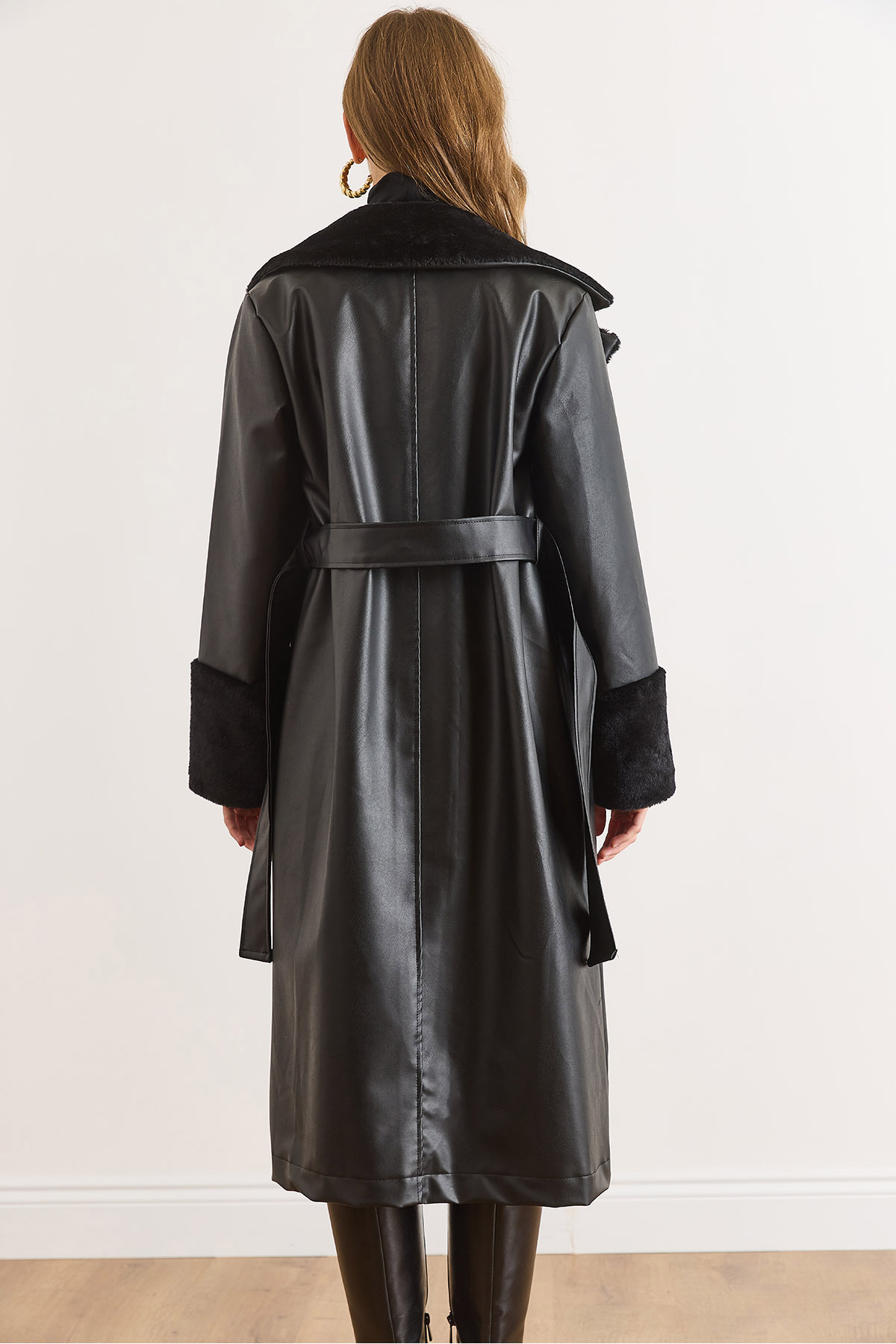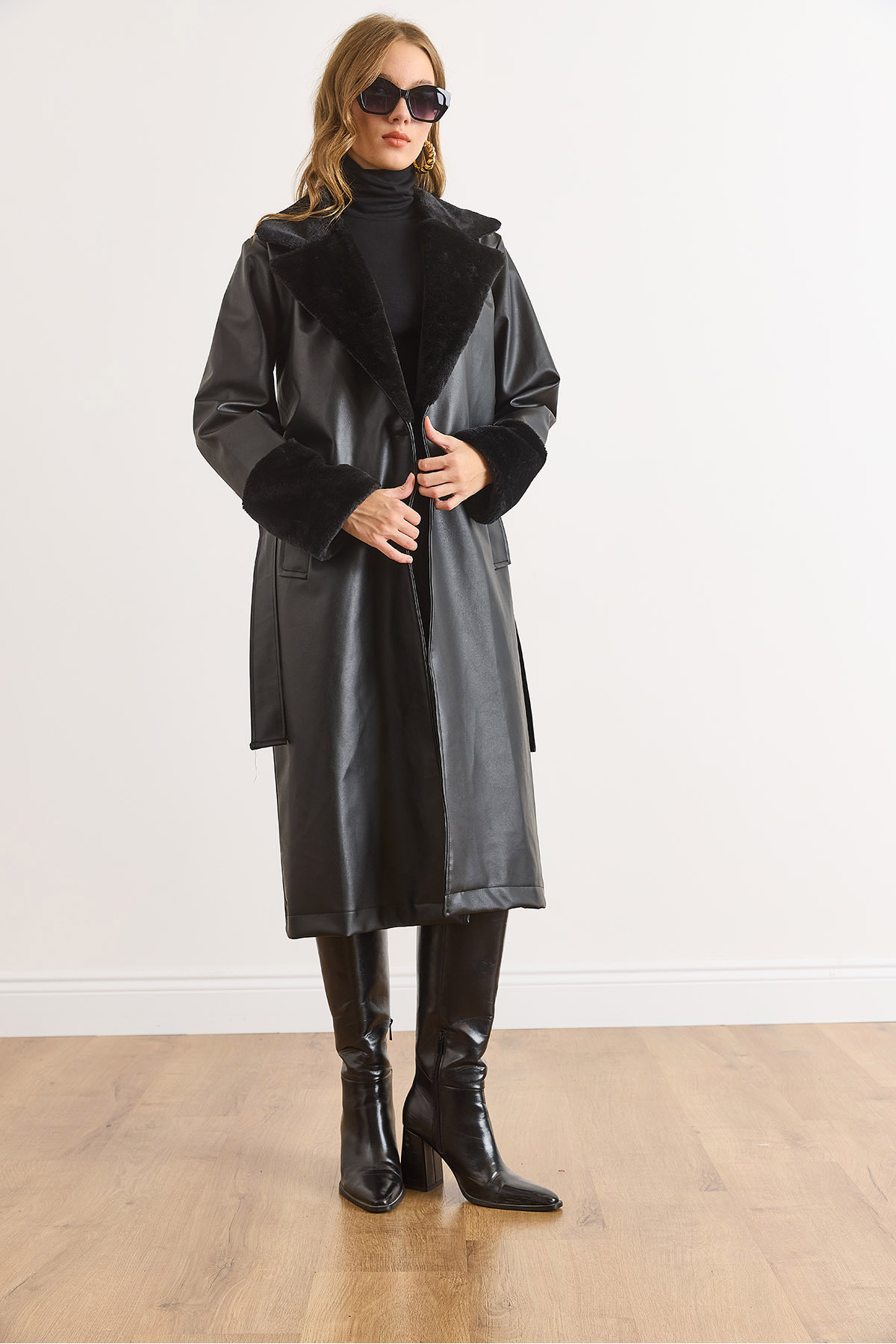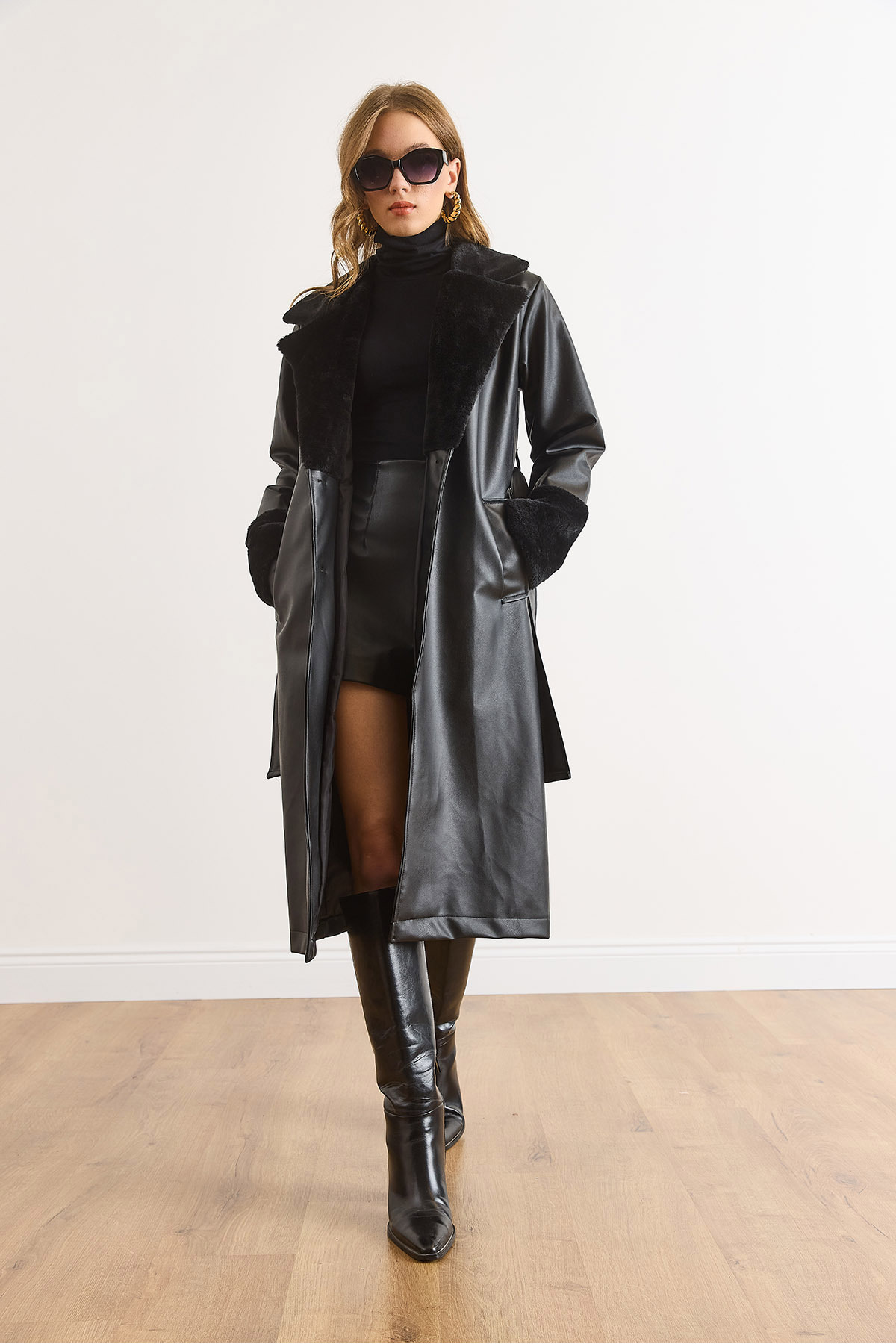 Kadın Siyah Astarlı Kürk Detaylı Cepli Suni Deri Trençkot TRC-00000012 Kadın Siyah Astarlı Kürk Detaylı Cepli Suni Deri Trençkot TRC-00000012 XL