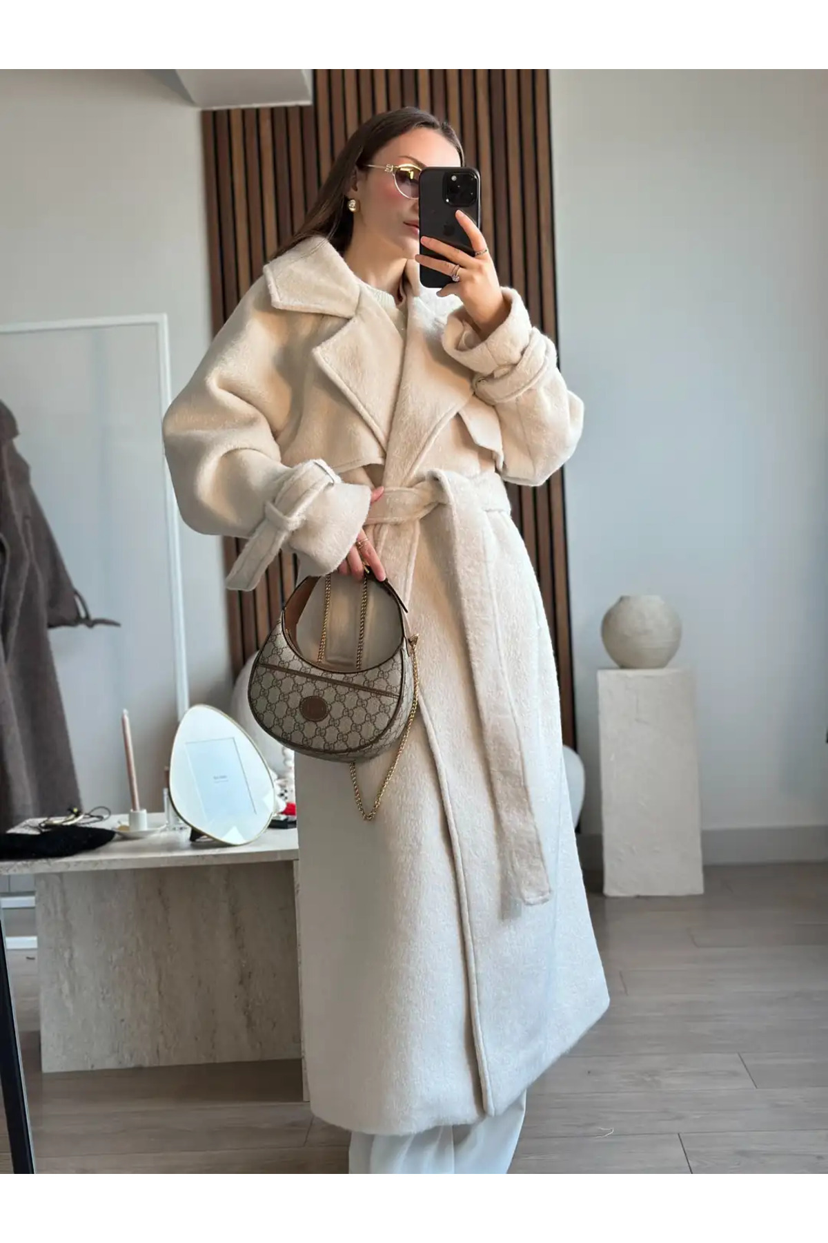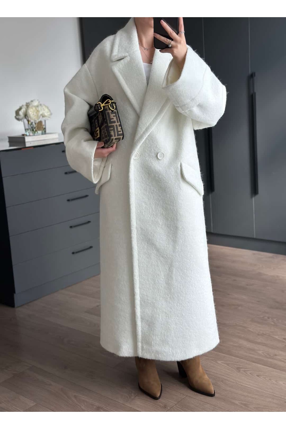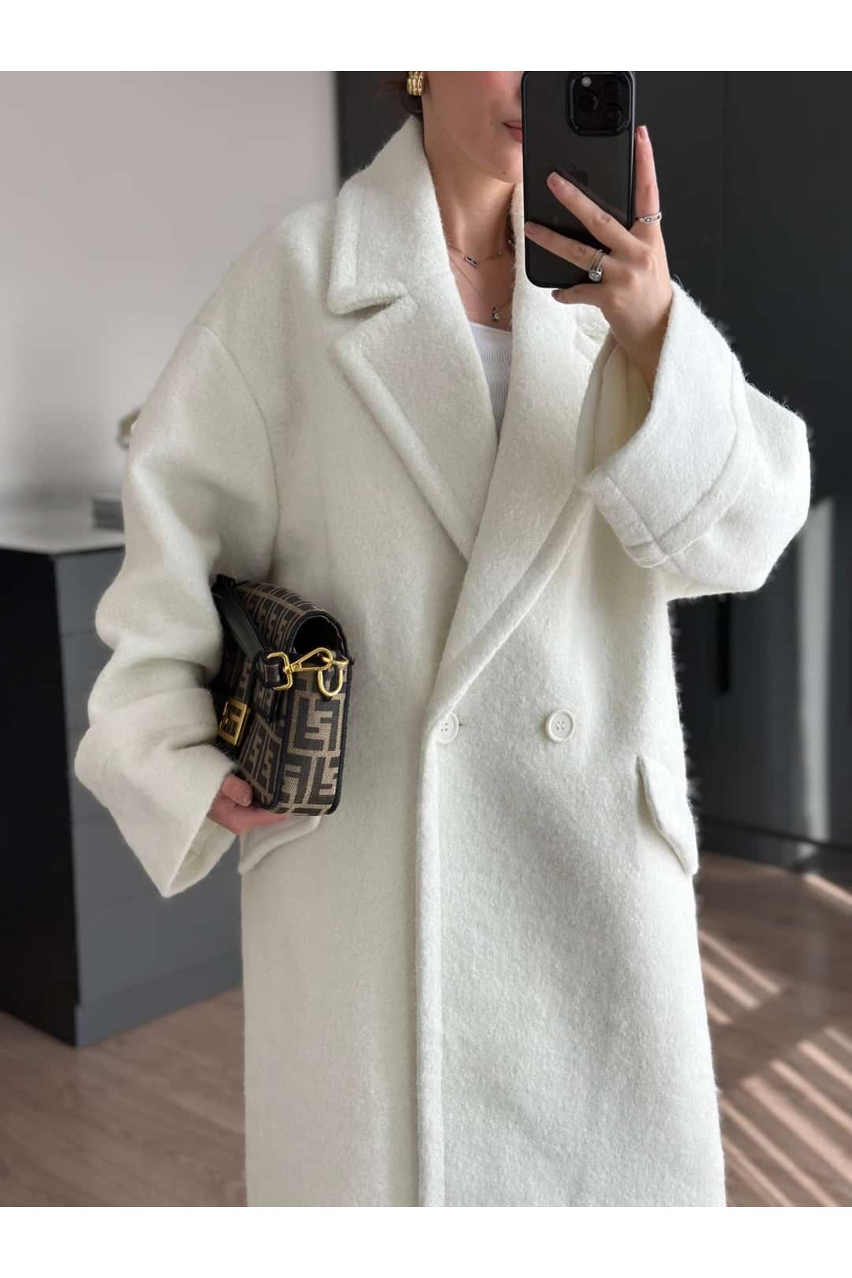 BUKLET DOKULU DUBLE KOL DETAYLI BEYAZ UZUN KABAN BUKLET DOKULU DUBLE KOL DETAYLI BEYAZ UZUN KABAN TGNSKU-00353 M