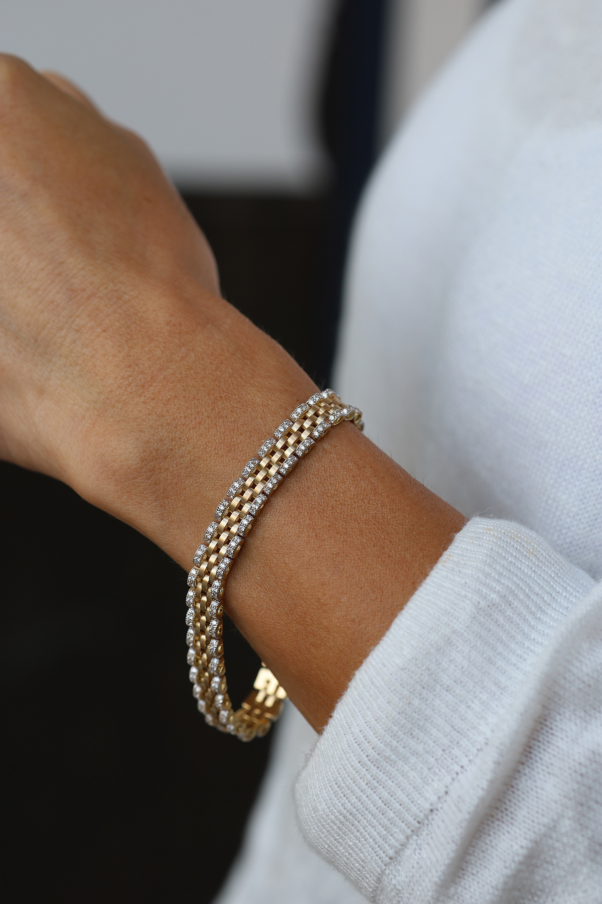 14 Ayar Altın Kenarları Taş Sıralı Saat Kordonu Bileklik 14 Ayar Altın Kenarları Taş Sıralı Saat Kordonu Bileklik BLK27623 تک سایز
