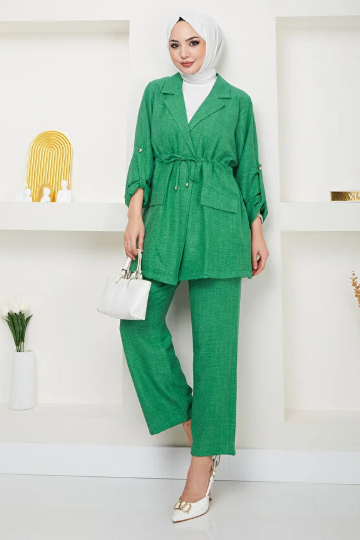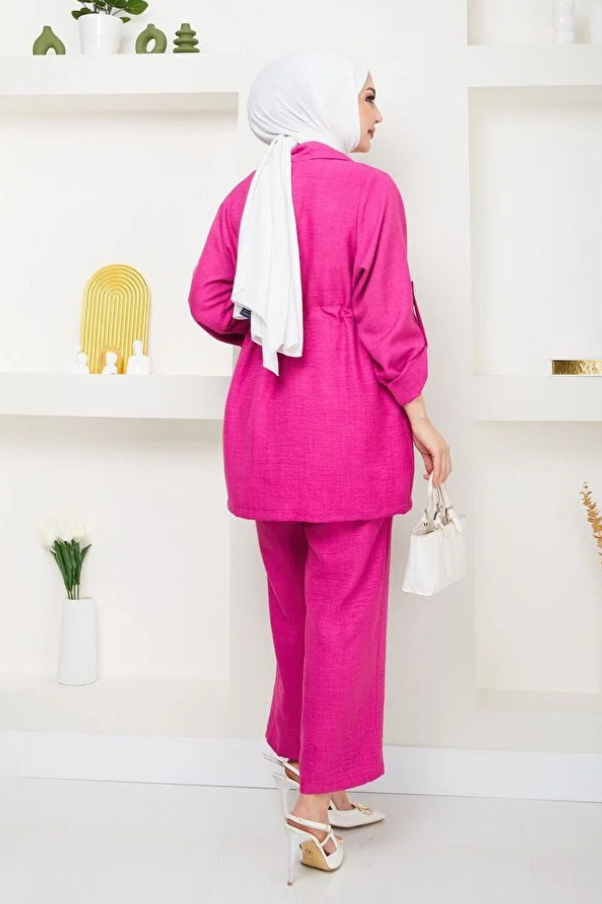 Beli Bağlamalı Ceket ve Pantolon Yazlık Keten Takım- Pembe Beli Bağlamalı Ceket ve Pantolon Yazlık Keten Takım- Pembe TD247 2XL