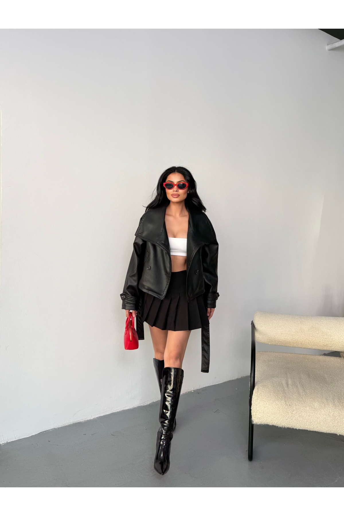 Kadın Kuşaklı Cepli Geniş Yaka Deri Trençkot Kadın Kuşaklı Cepli Geniş Yaka Deri Trençkot Laluna1130DTV L