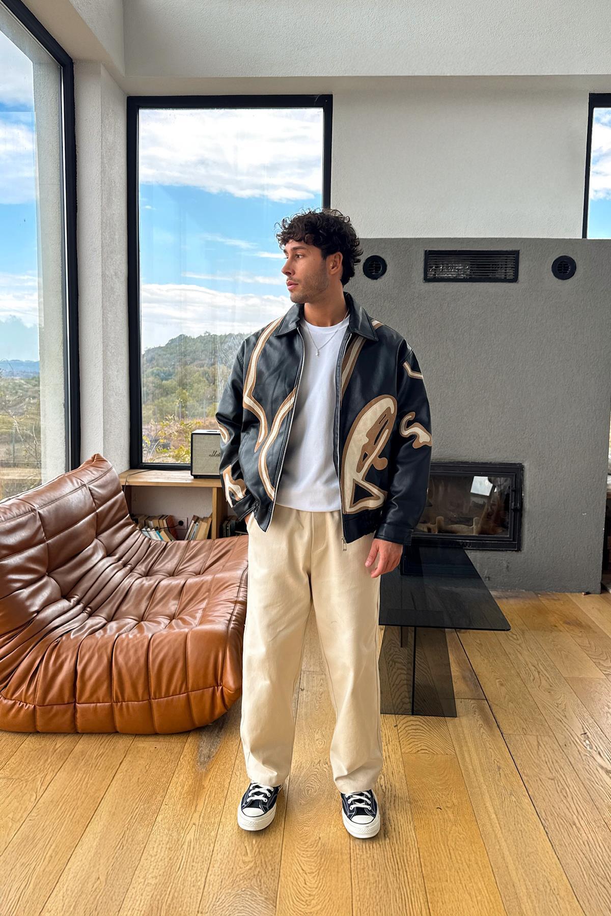 Relax Fit Nakışlı Deri Ceket Relax Fit Nakışlı Deri Ceket FLAW-242-022-012 XL