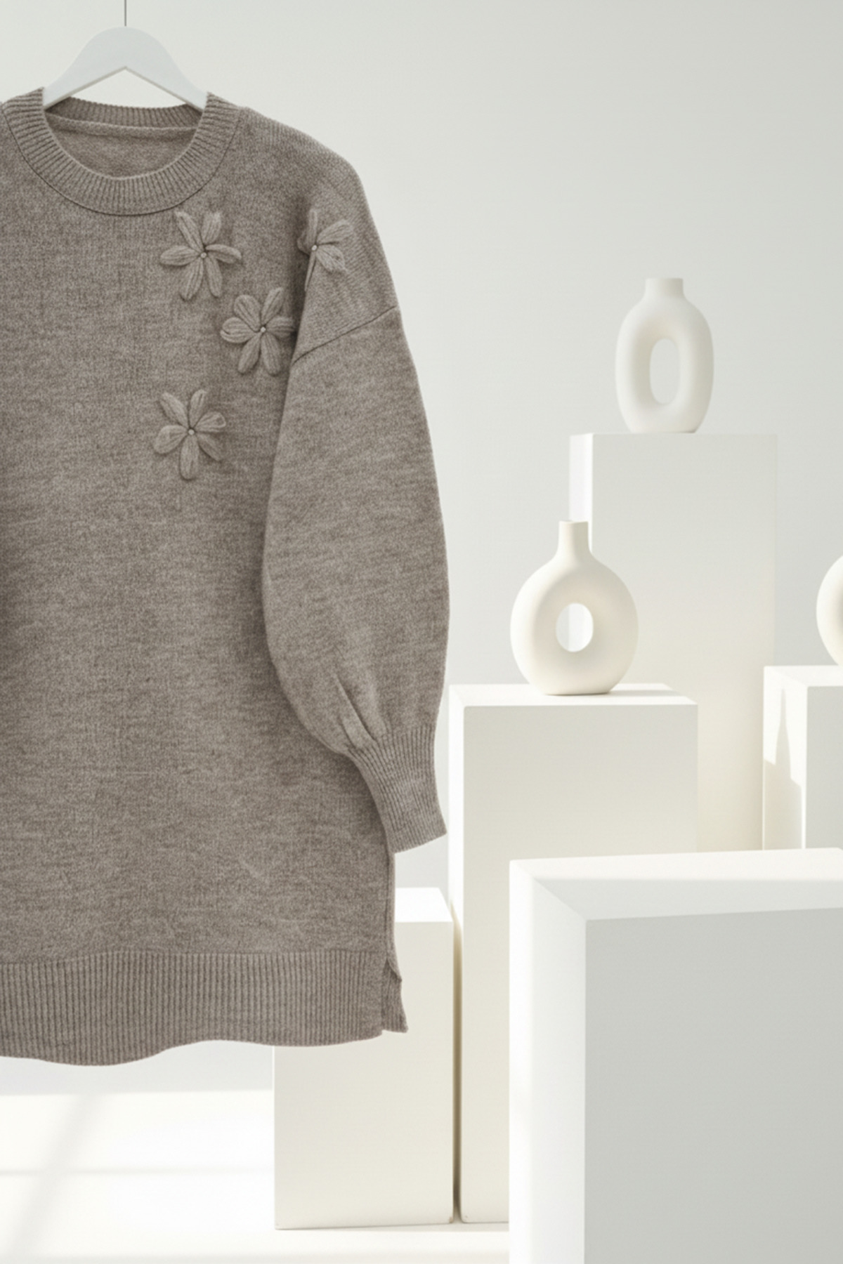 Çiçek Desenli Yumoş İplik Triko Kazak Tunik Çiçek Desenli Yumoş İplik Triko Kazak Tunik 12-4515 Standart