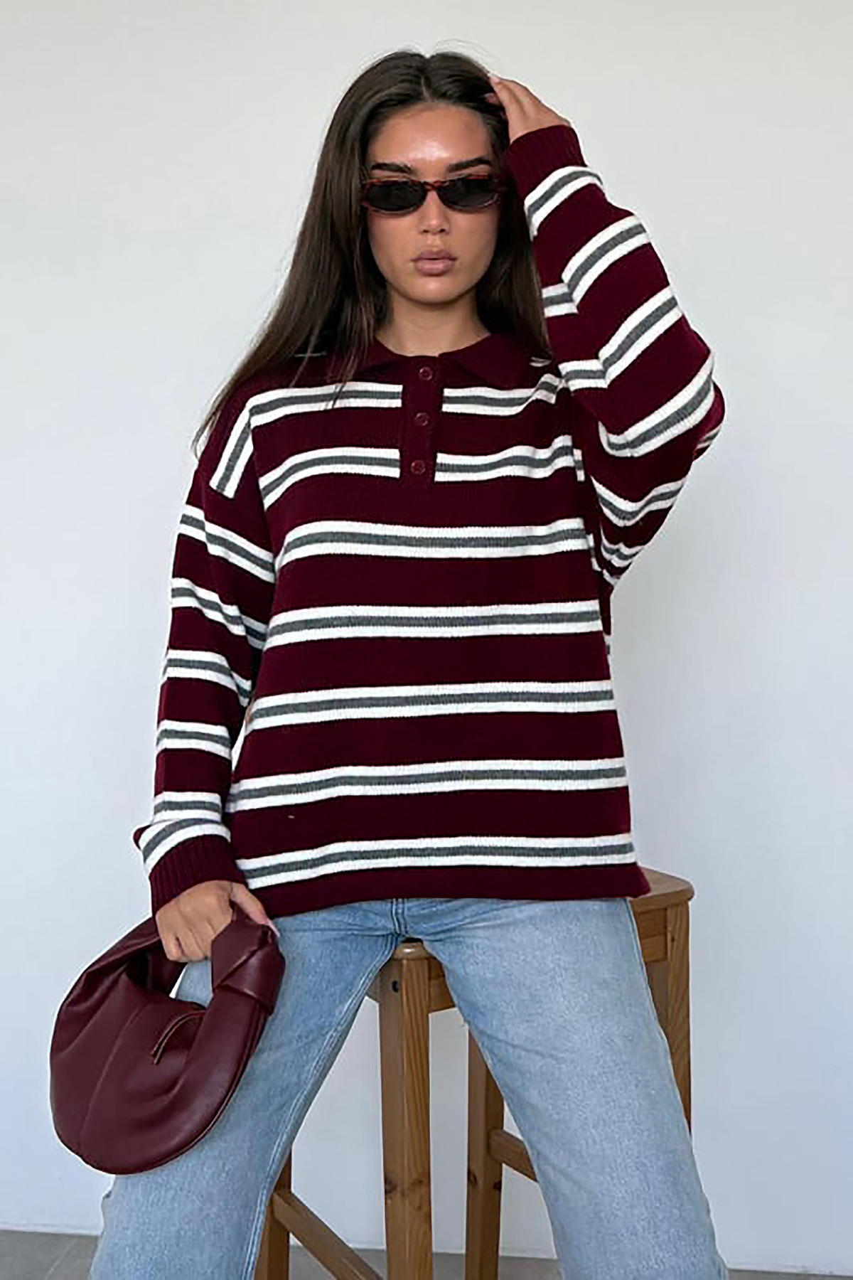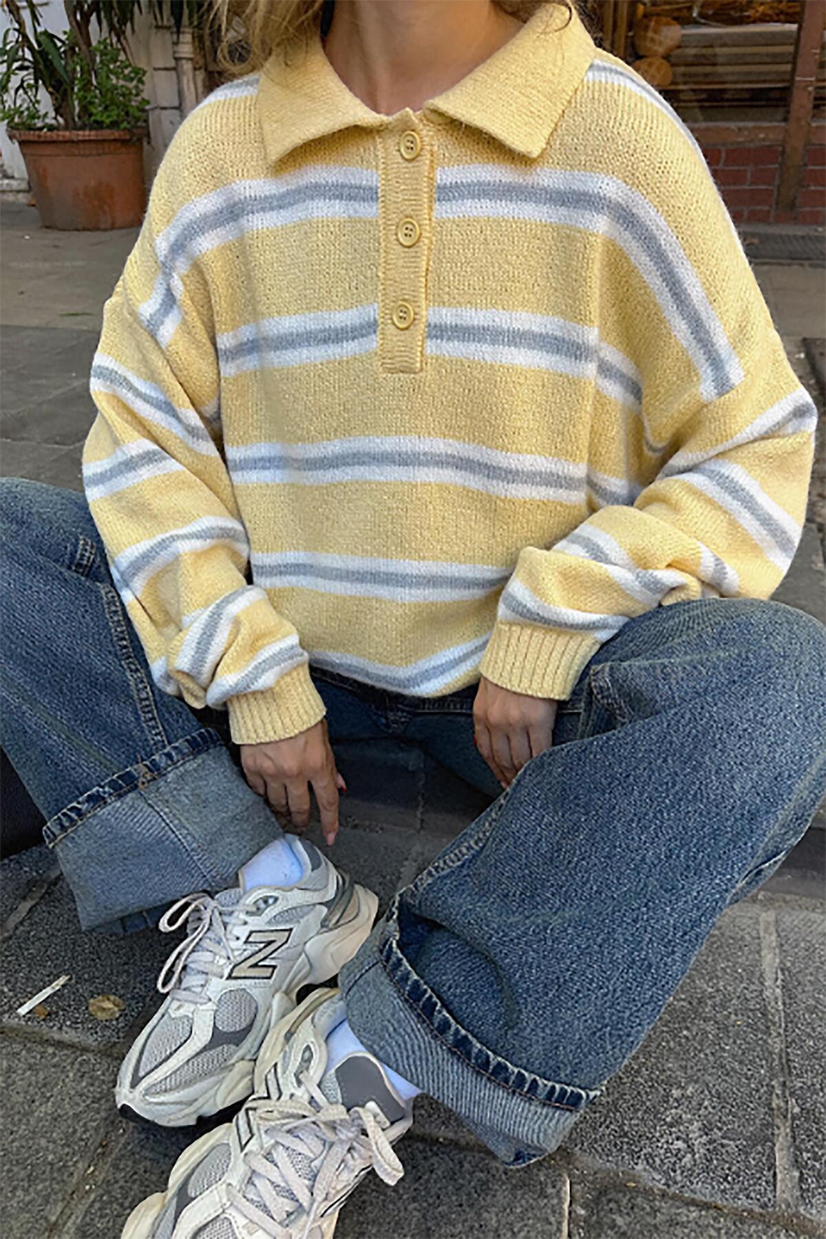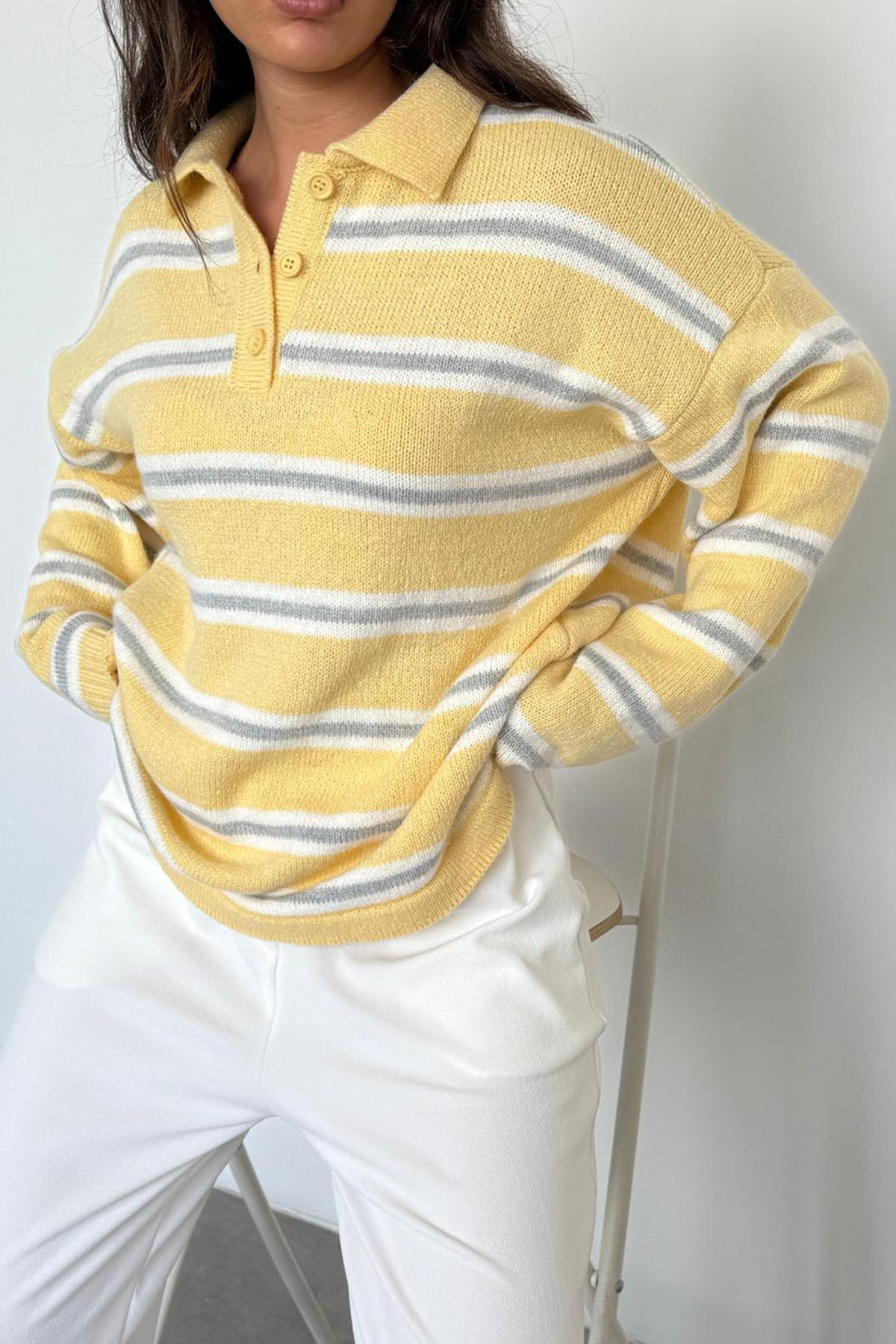 Sarı Polo Yaka Çizgili Kadın Triko Kazak Sarı Polo Yaka Çizgili Kadın Triko Kazak EBMG2469 L