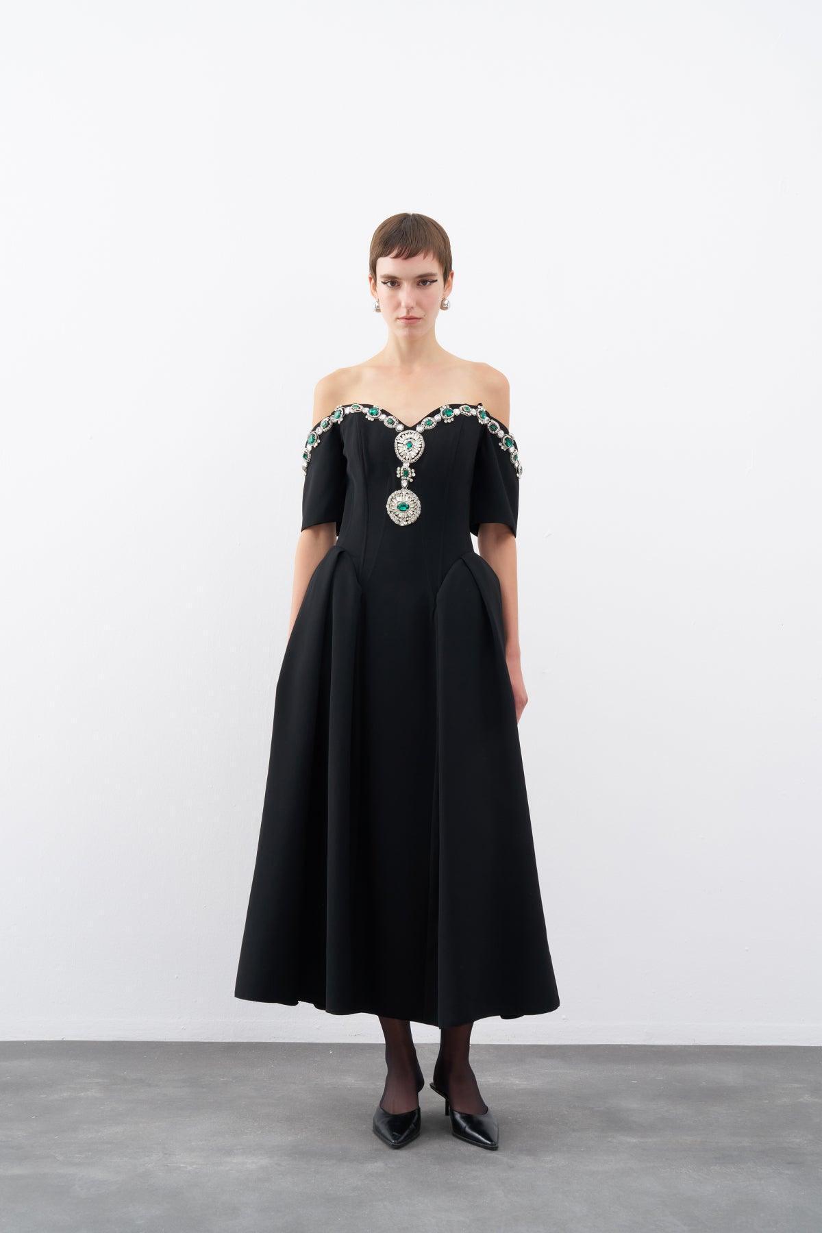 Taş işlemeli Düşük Omuz Pileli Midi Abiye Elbise Taş işlemeli Düşük Omuz Pileli Midi Abiye Elbise M25YCR001162 44