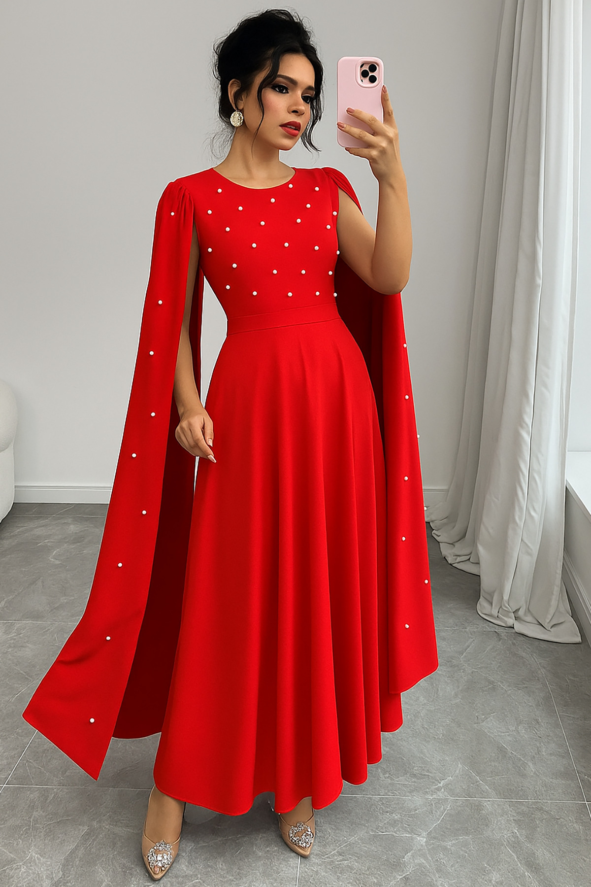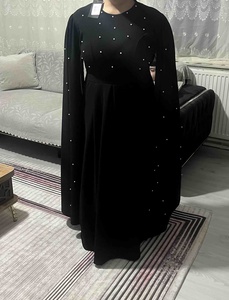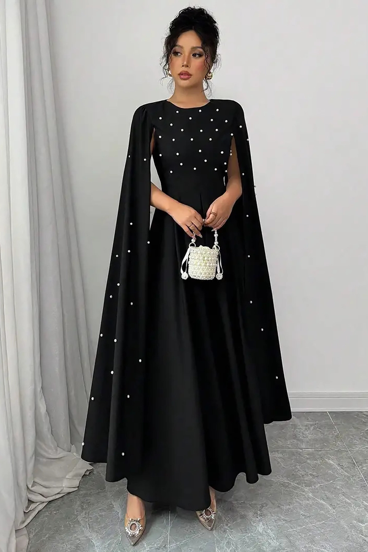 Siyah Pelerin Kollu İnci Detay Bel Kuşaklı Yuvarlak Yaka Krep Kumaş Elbise Siyah Pelerin Kollu İnci Detay Bel Kuşaklı Yuvarlak Yaka Krep Kumaş Elbise DFX396530 XL