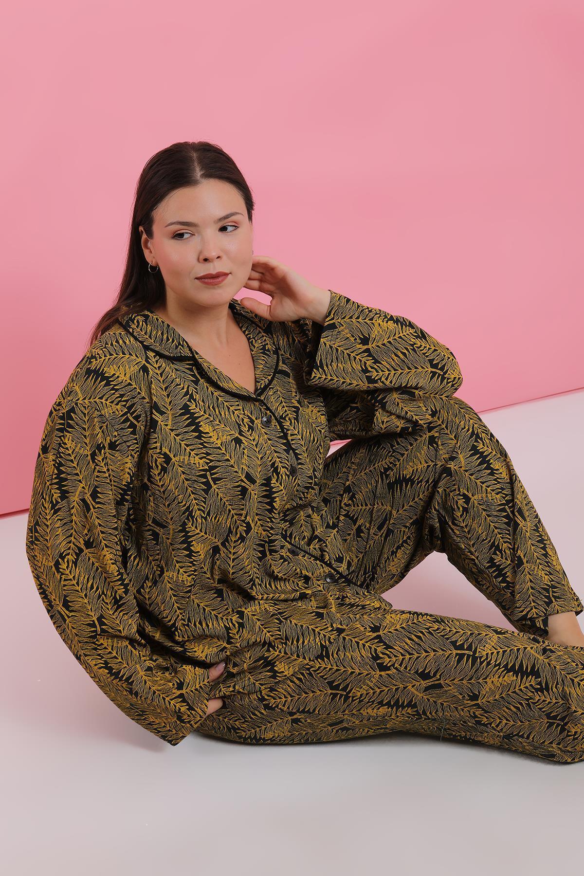 Kadın Büyük Beden Tropikal Yaprak Desenli Düğmeli Pijama Takımı Kadın Büyük Beden Tropikal Yaprak Desenli Düğmeli Pijama Takımı 202523 10XL