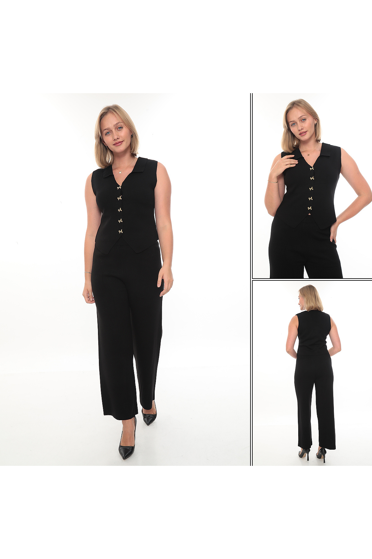 Kadın Gold Düğme Detay Yelekli Triko 2li Takım Kadın Gold Düğme Detay Yelekli Triko 2li Takım 141762 L