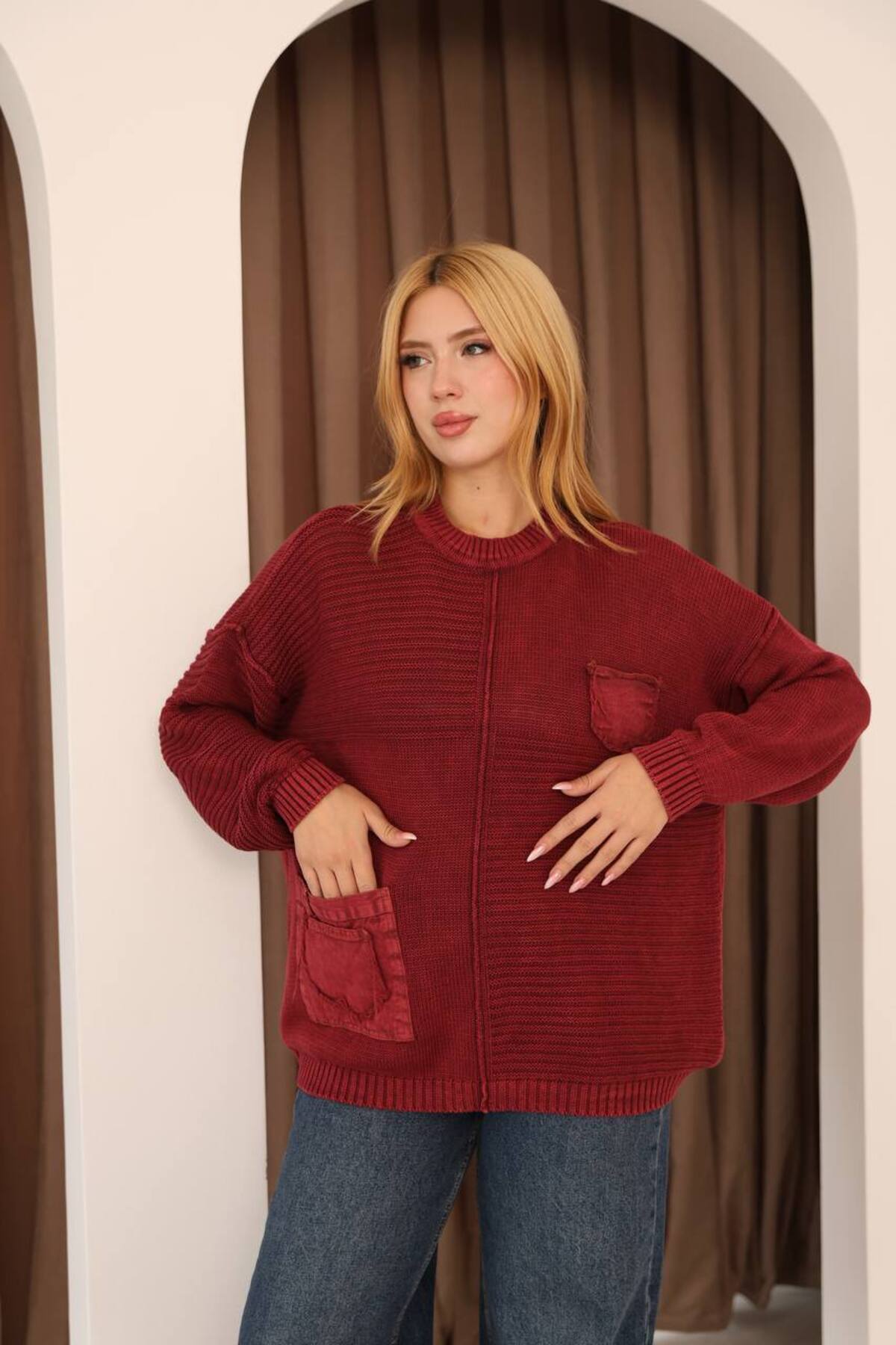 Kadın Bordo Torba Cepli Eskitme Detaylı Oversize Salaş Pamuklu Triko Kazak Bluz Kadın Bordo Torba Cepli Eskitme Detaylı Oversize Salaş Pamuklu Triko Kazak Bluz 2579-SCHS Standart