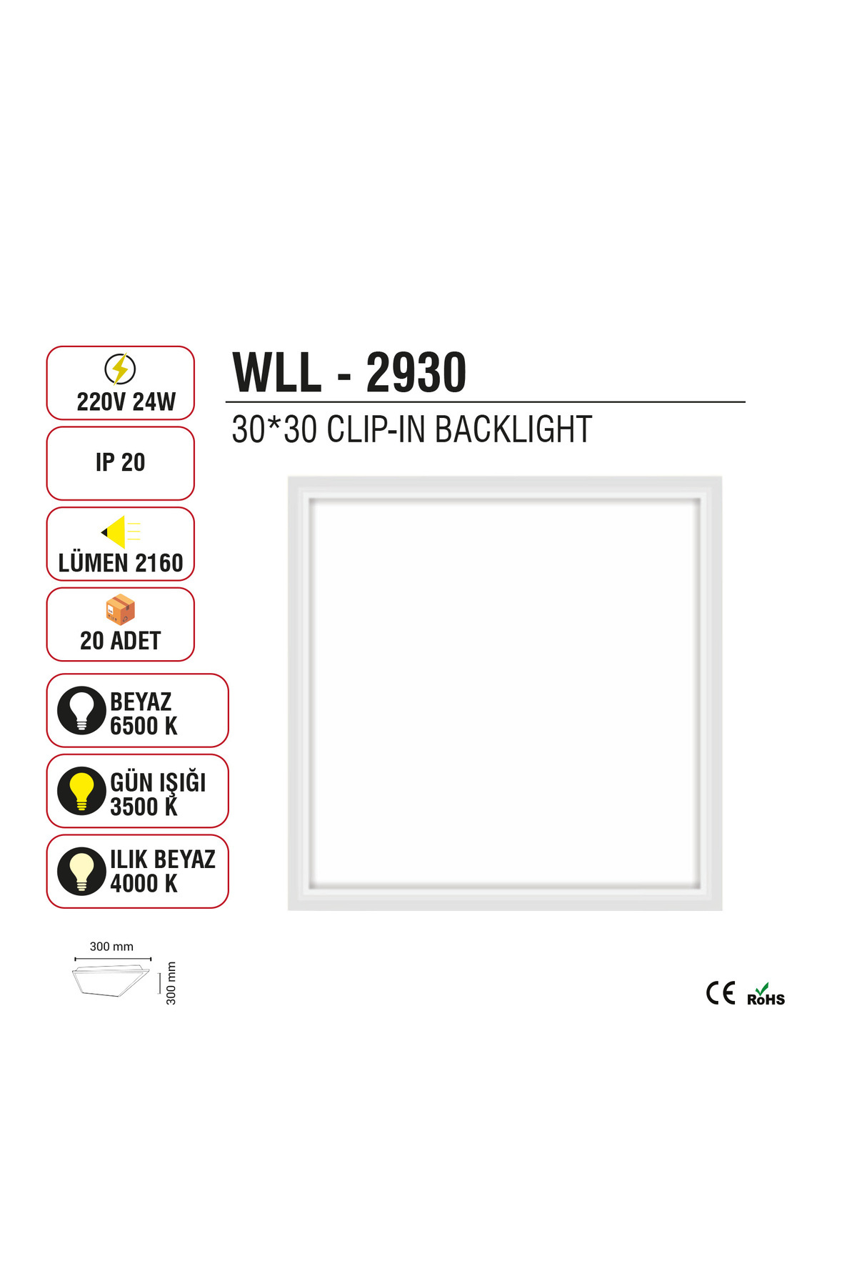asma tavan led armatür 30x30 klipin led 6500 k 24w beyaz asma tavan led armatür 30x30 klipin led 6500 k 24w beyaz WLL-2930 تک سایز