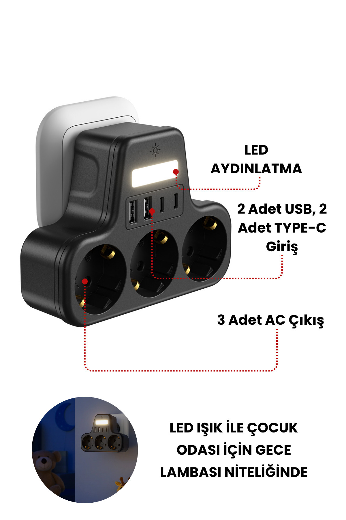 akım korumalı priz gece lambalı 3'LÜ Priz 2XUSB 2XType-C Çıkışlı Grup Priz Çoğaltıcı akım korumalı priz gece lambalı 3'LÜ Priz 2XUSB 2XType-C Çıkışlı Grup Priz Çoğaltıcı ZP-764 تک سایز