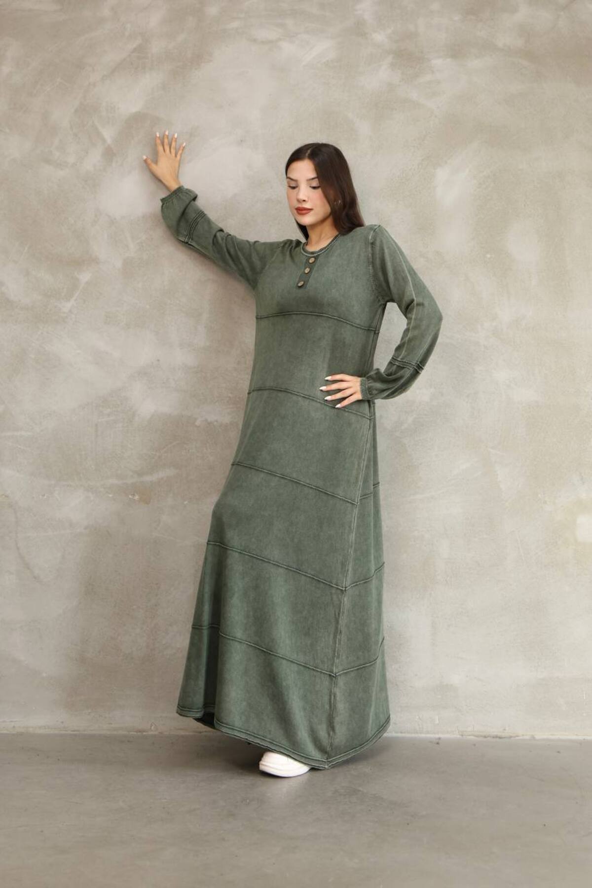 Kadın Haki Düğme Detaylı Yuvarlak Yakalı Uzun Kollu Eskitme Detaylı Salaş Pamuklu Triko Uzun Elbise Kadın Haki Düğme Detaylı Yuvarlak Yakalı Uzun Kollu Eskitme Detaylı Salaş Pamuklu Triko Uzun Elbise 2553-SCHS Standart