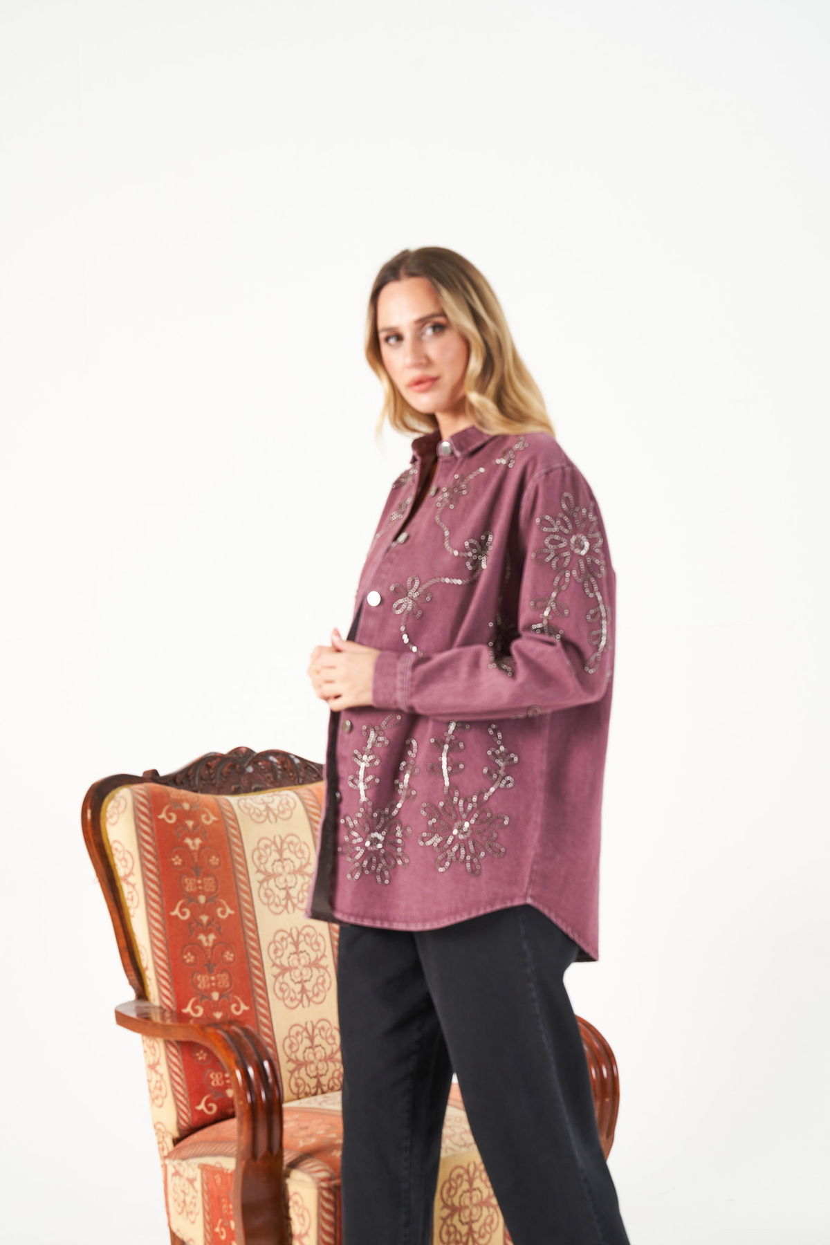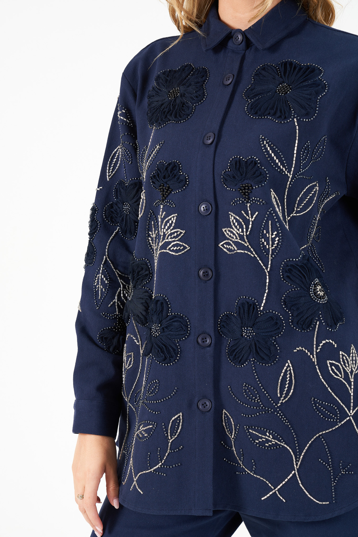 KADIN ÖNÜ VE KOLLARI BONCUK İŞLEMELİ GABRDİN KUMAŞ OVERSİZE GÖMLEK KADIN ÖNÜ VE KOLLARI BONCUK İŞLEMELİ GABRDİN KUMAŞ OVERSİZE GÖMLEK 2074 Standart