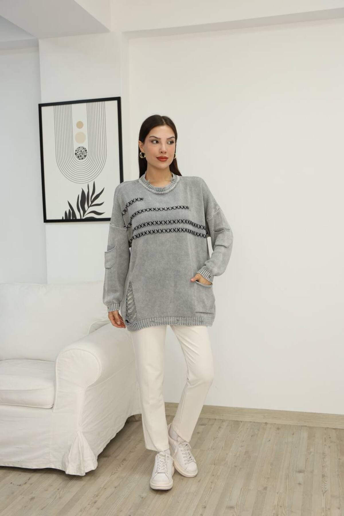 Kadın Gri Yuvarlak Yaka Eskitme ve Yırtık Detaylı Cepli Uzun Kollu Salaş Pamuk Triko Kazak Bluz Kadın Gri Yuvarlak Yaka Eskitme ve Yırtık Detaylı Cepli Uzun Kollu Salaş Pamuk Triko Kazak Bluz 2561-SCHS Standart