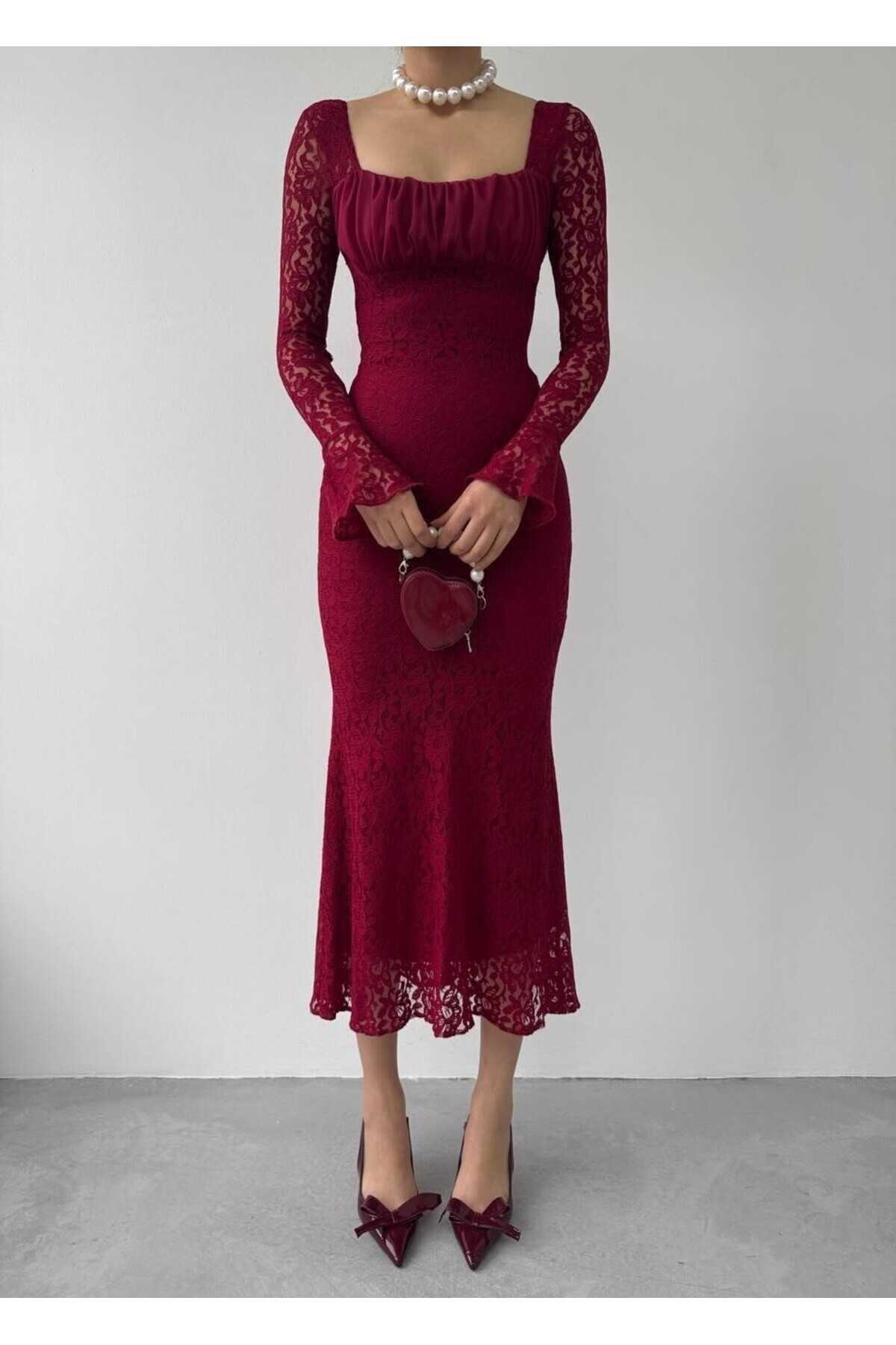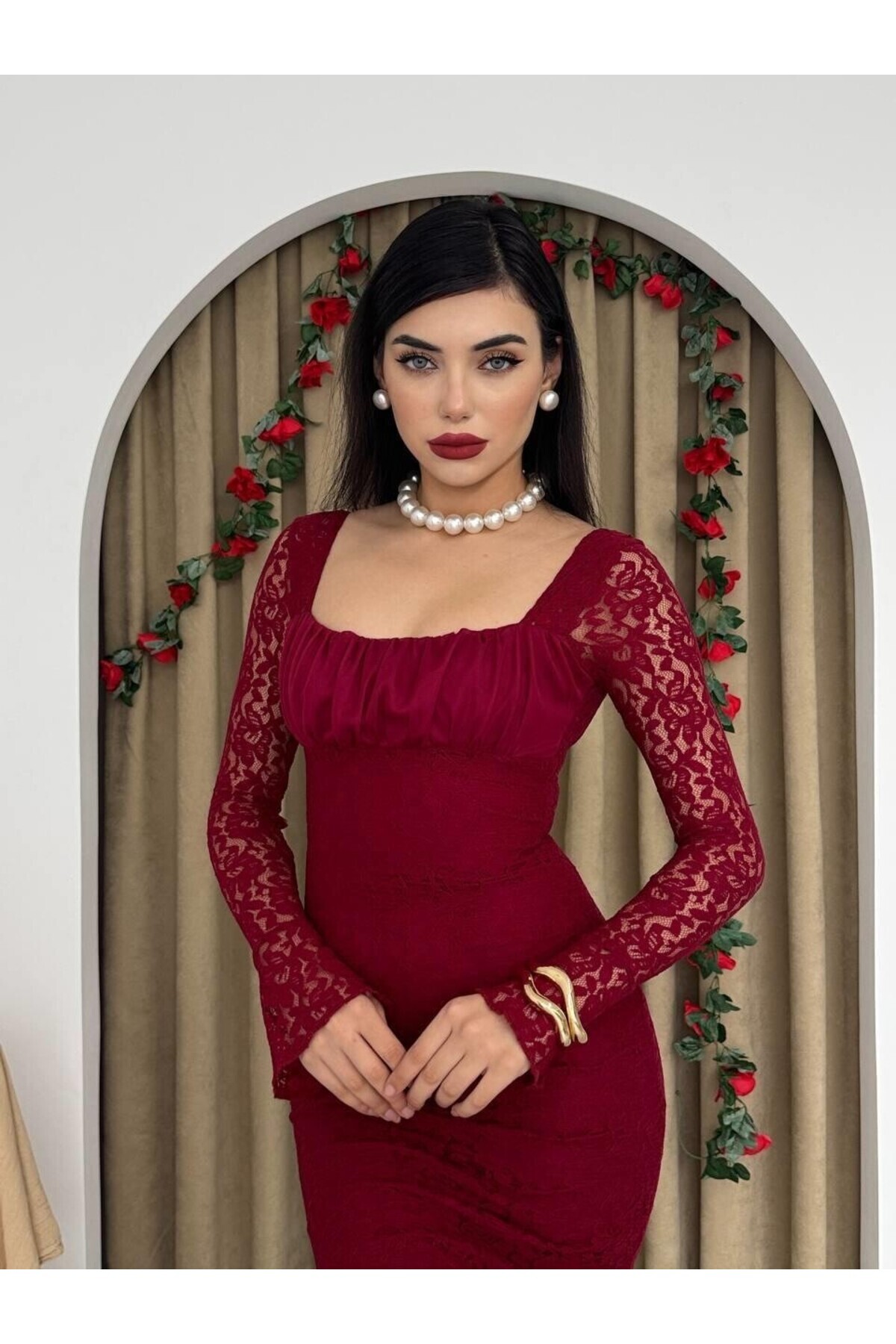 Kare Dantel Yaka Astarlı Midi Boy Premium Dantel Elbise Kare Dantel Yaka Astarlı Midi Boy Premium Dantel Elbise JD0DANT660 L