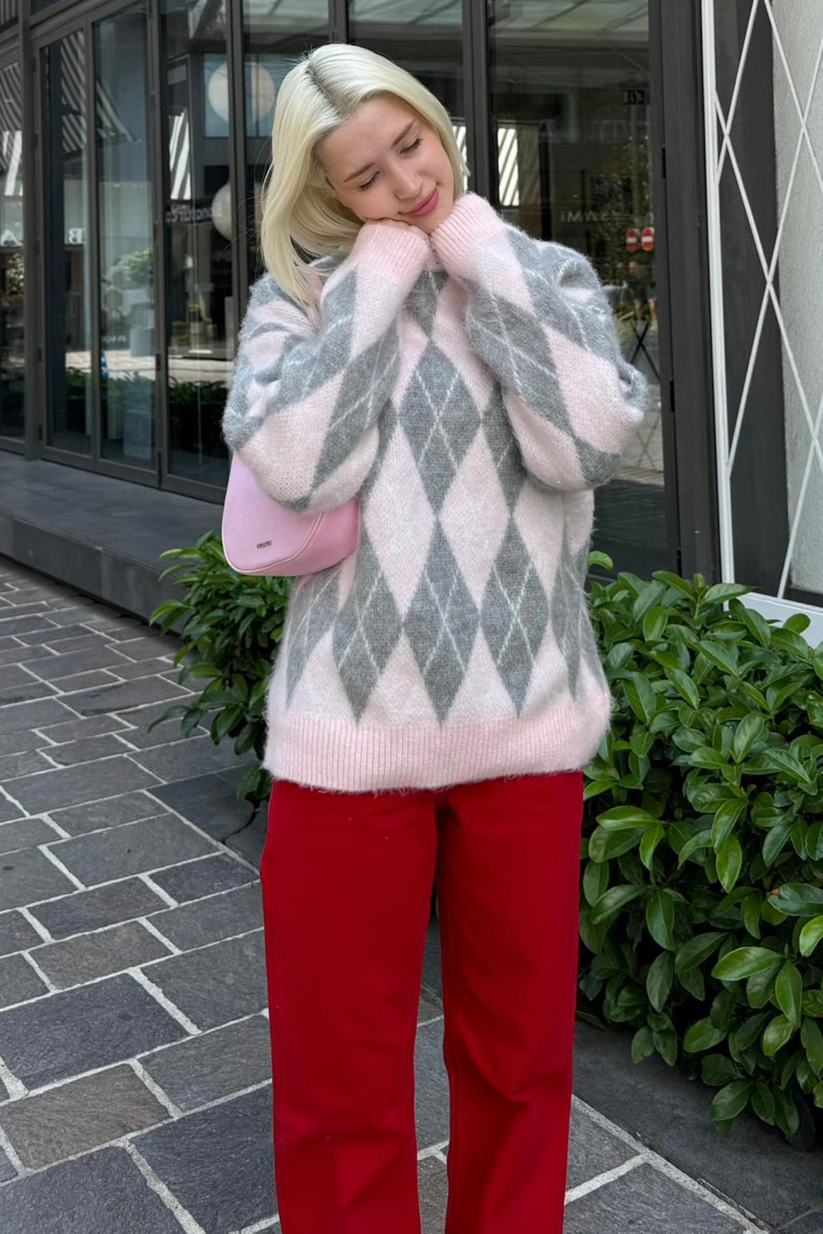Pembe Bisiklet Yaka Şardonlu Baklava Desenli Kazak Pembe Bisiklet Yaka Şardonlu Baklava Desenli Kazak EBMG2493 L