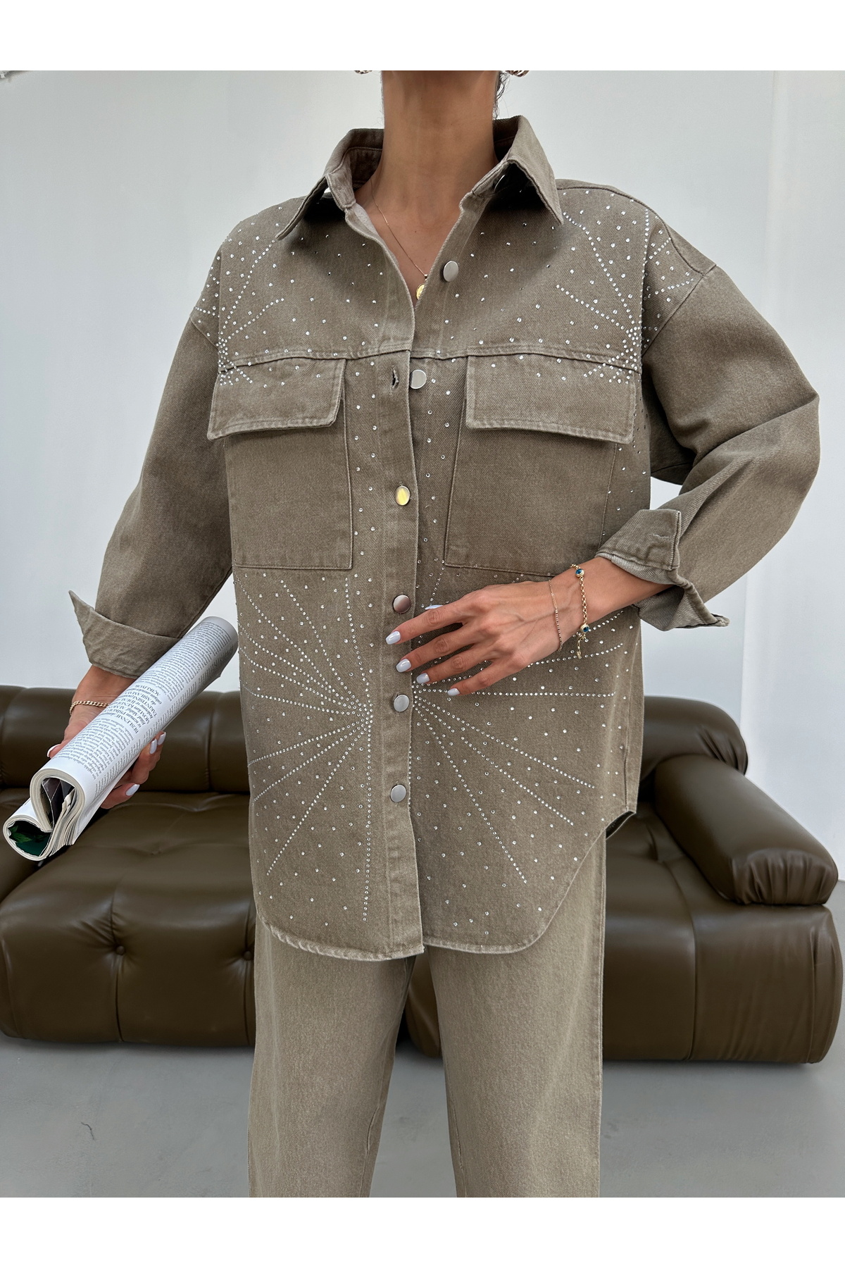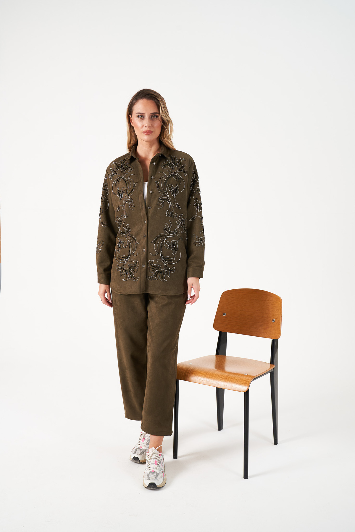 KADIN ÖNÜ VE KOLLARI BONCUK İŞLEMELİ SÜVET KUMAŞ OVERSİZE GÖMLEK KADIN ÖNÜ VE KOLLARI BONCUK İŞLEMELİ SÜVET KUMAŞ OVERSİZE GÖMLEK 2069 Standart