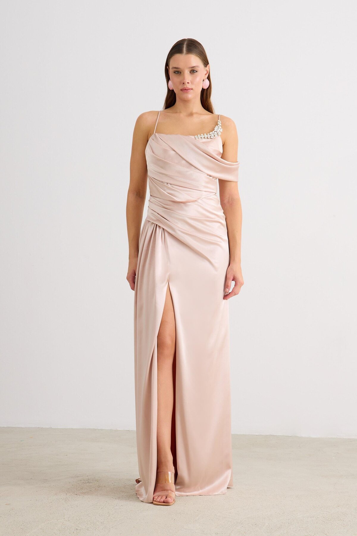Kahve Askılı Yırtmaçlı Saten Abiye Elbise Kahve Askılı Yırtmaçlı Saten Abiye Elbise 58576 42