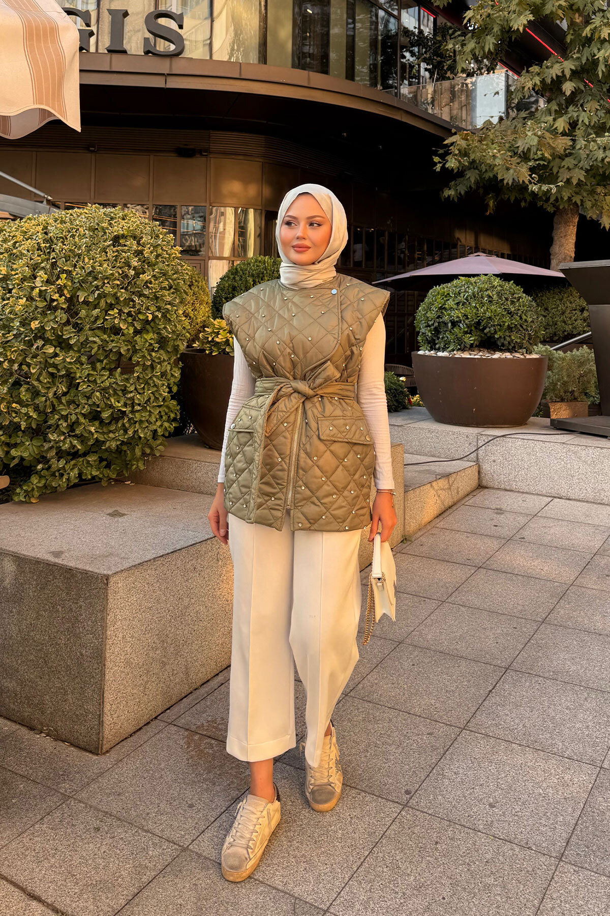 Kadın Taş Detaylı Kapitone Yelek Haki Yeşil Kadın Taş Detaylı Kapitone Yelek Haki Yeşil 266-3034 L/XL
