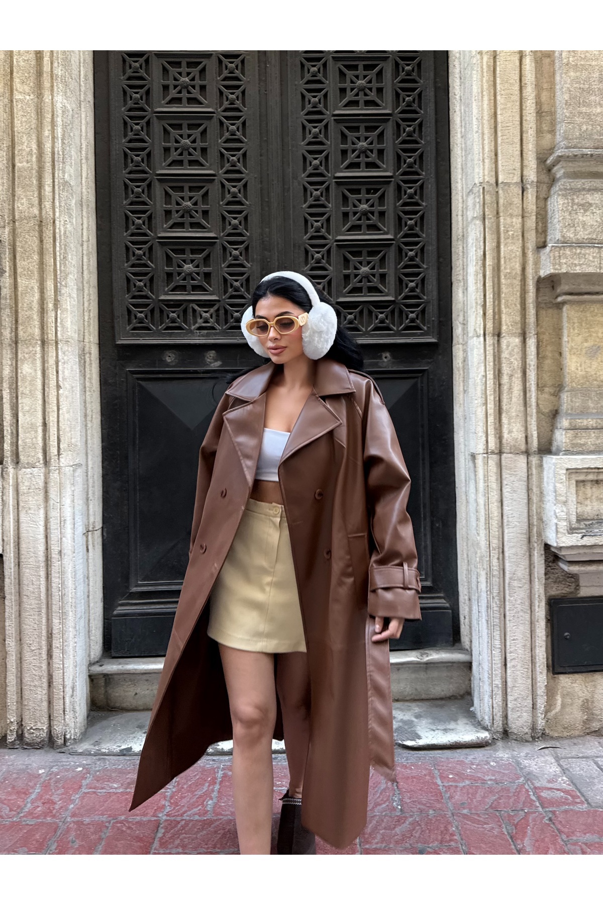 Kadın Kuşak Detaylı Dik Yaka Deri Trençkot Kadın Kuşak Detaylı Dik Yaka Deri Trençkot FM8505 L