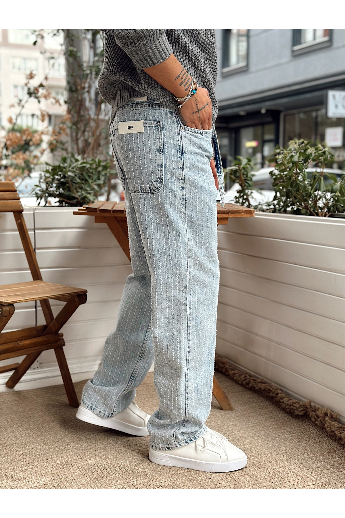Beli İpli Kabartma Şeritli Regular Kot Pantolon Mavi Beli İpli Kabartma Şeritli Regular Kot Pantolon Mavi MP4061 XL