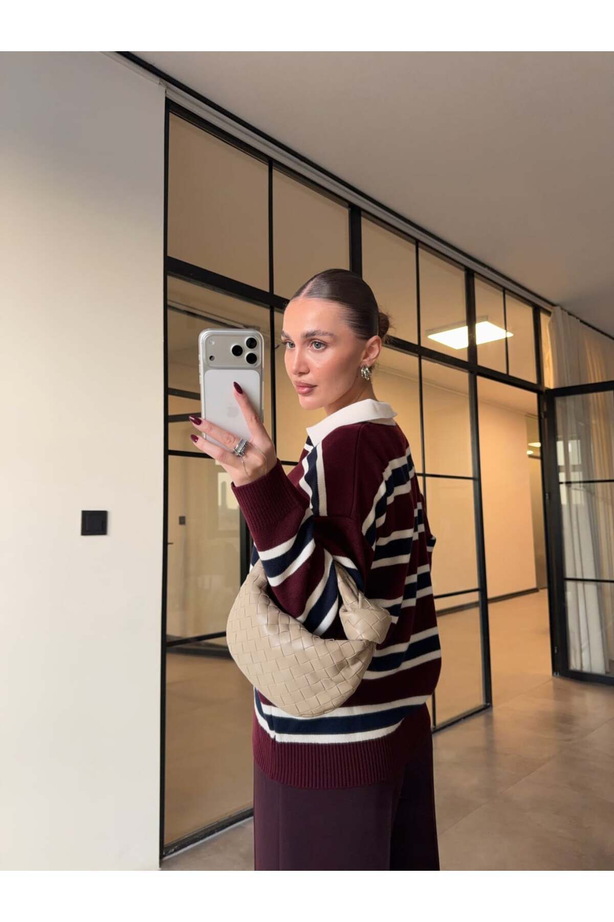 Kadın POLO YAKA BORDO-KREM ÇİZGİLİ KAZAK Kadın POLO YAKA BORDO-KREM ÇİZGİLİ KAZAK BB26QU1184B Standart