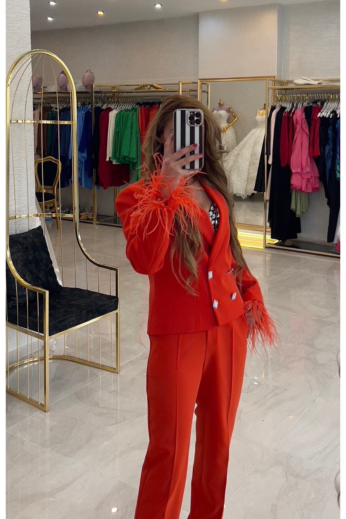 Tüy Detaylı Pembe Ceket ve Pantolon Takım Tüy Detaylı Pembe Ceket ve Pantolon Takım TYCA311A9276153FAE9DCB400 42