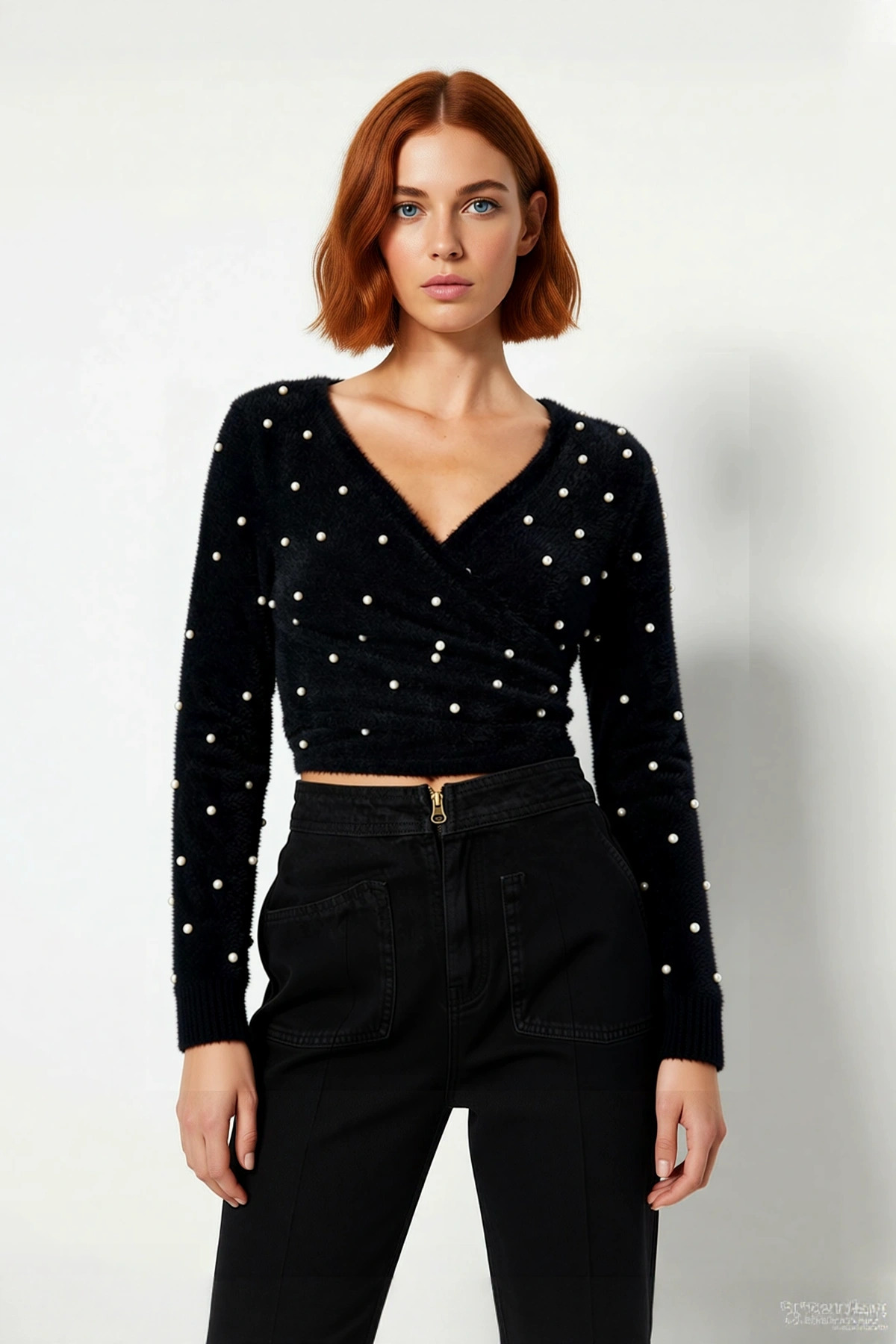 Kadın Siyah Tüylü V Yaka Super Crop İşlemeli İnci Detaylı Şık Triko Kazak Kışlık Kombinlerin Gözdesi Kadın Siyah Tüylü V Yaka Super Crop İşlemeli İnci Detaylı Şık Triko Kazak Kışlık Kombinlerin Gözdesi MS2145758964 L